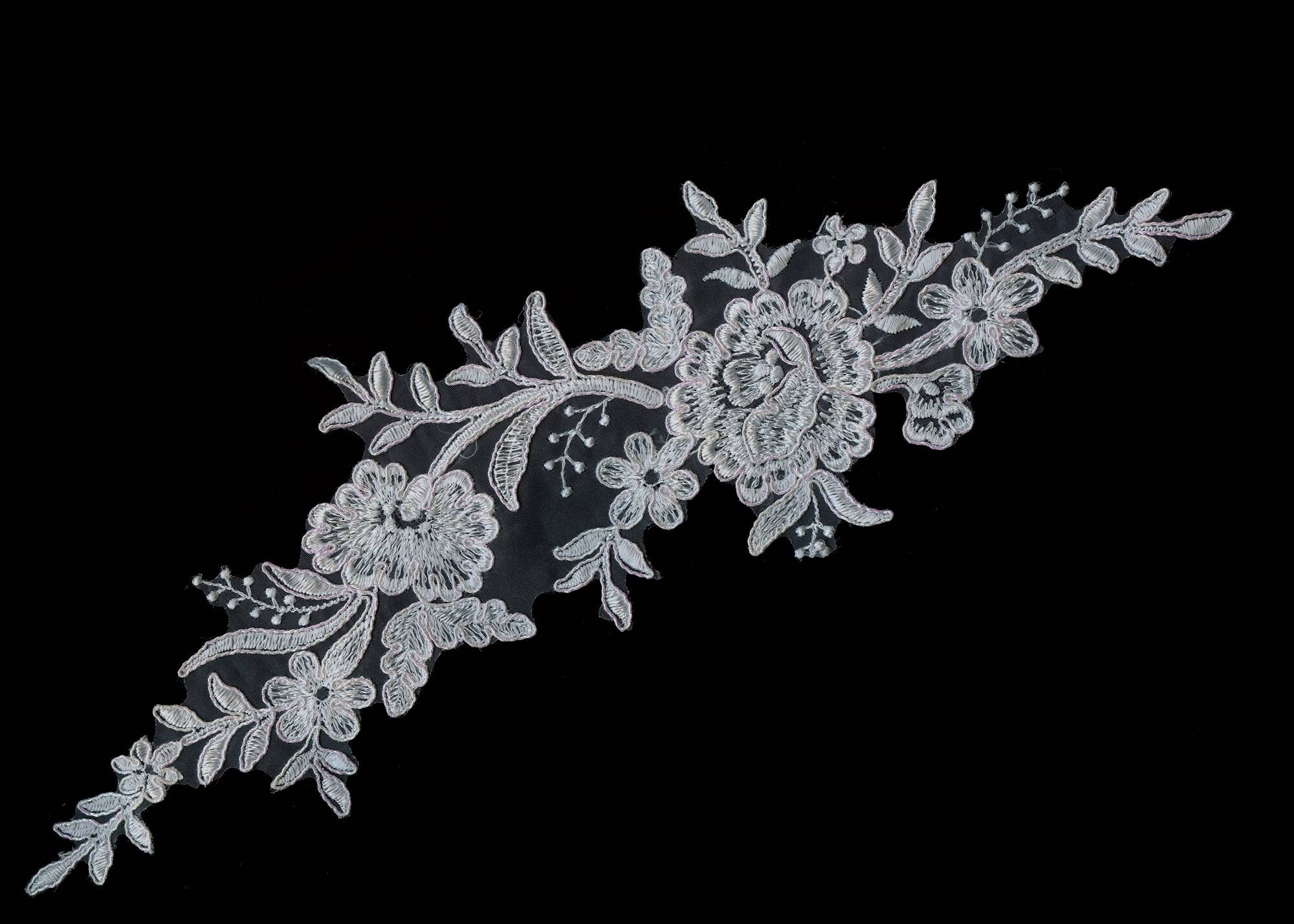 Аппликация с кордом белого цвета и эффектом перламутра поражает изысканностью и нежностью. Эта деталь создает элегантный акцент, добавляет изящества и стиля. Приблизительный размер - 25х11 см.