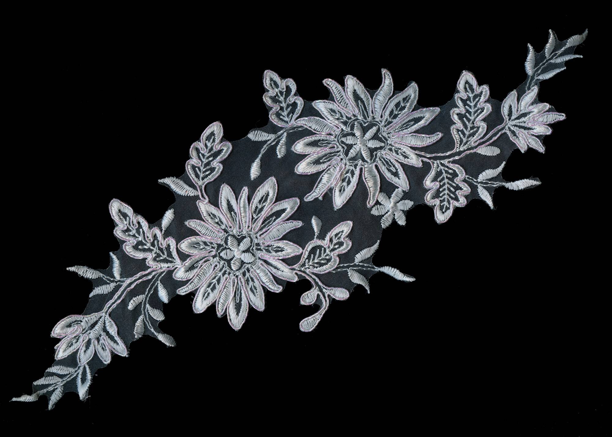 Аппликация с кордом в белом цвете с эффектом перламутра, которая включает изображение цветов со многими лепестками. В центре большого цветка расположен маленький цветочек. Это придает аппликации неповторимости и элегантности. Приблизительный размер - 30х15см.