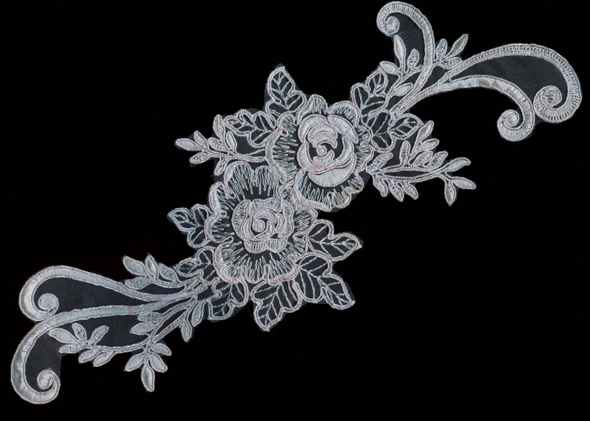 Аппликация с кордом, выполненная в белом цвете с перламутровым отливом, содержит два цветка, щедро обрамленные листьями. Эта изысканная деталь придаст вашему наряду элегантности и украсит образ. Приблизительный размер - 28х13см.