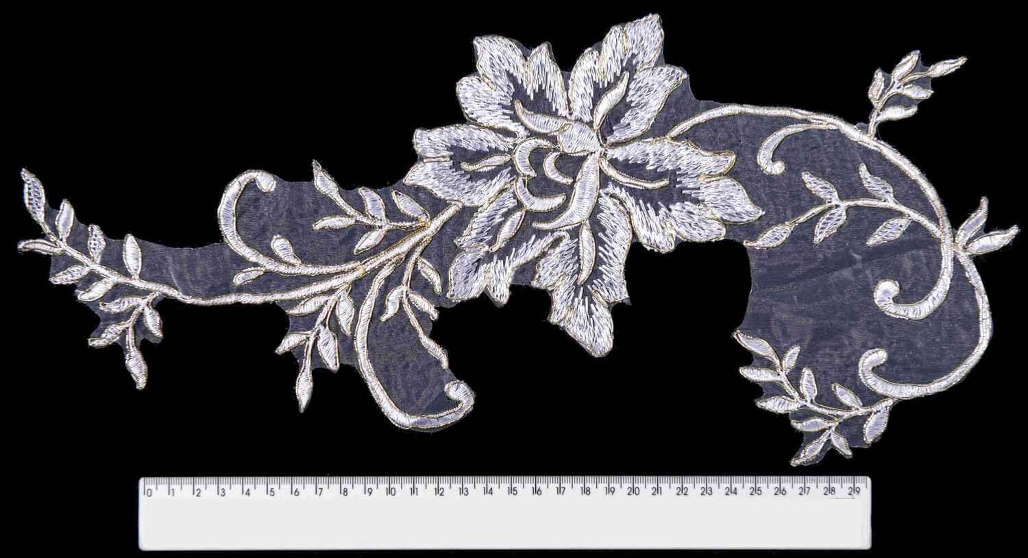 Аппликация с кордом в кремовом цвете с перламутром поражает изысканностью и оригинальным дизайном. Узор изделия представлен цветком, обрамленным листиками и завитками. Золотые элементы придают аппликации благородства и роскоши. Она станет элегантным дополнением к вечернему или свадебному наряду. Приблизительный размер - 16х41 см.