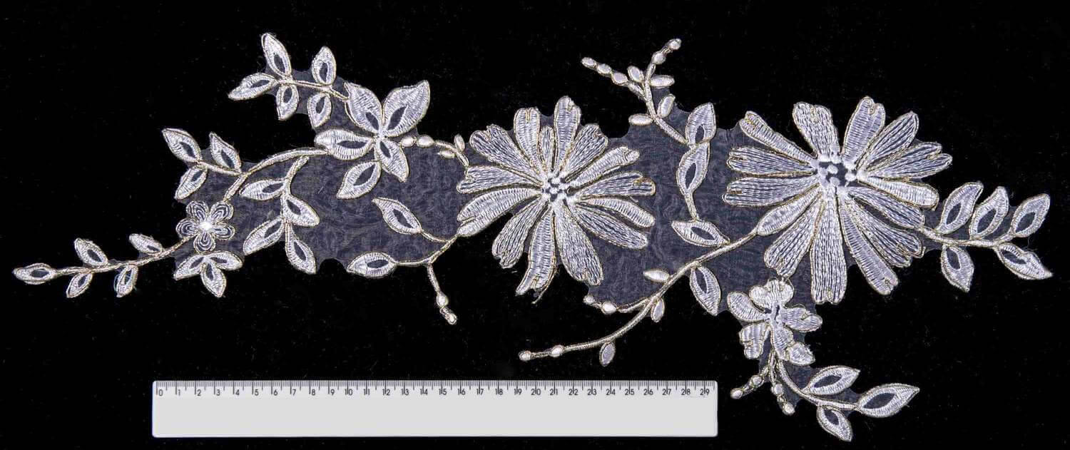 Аппликация с кордом в белом цвете с золотым отливом поражает изяществом и роскошью. Каждая деталь создает элегантный цветочный узор. Может служить стильным декором для вечернего или свадебного наряда. Приблизительный размер - 18х47 см.