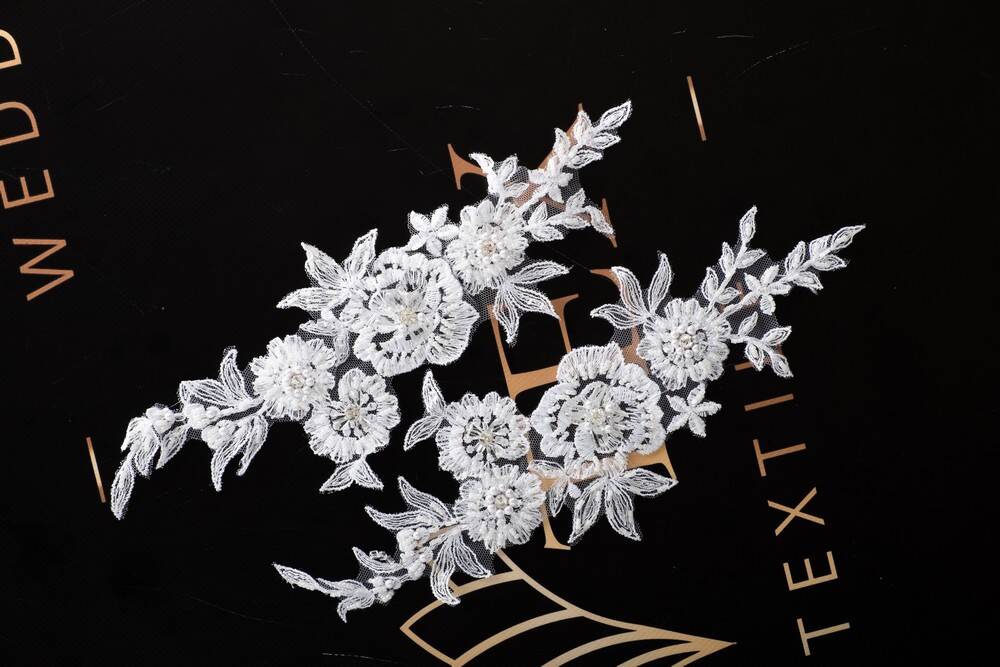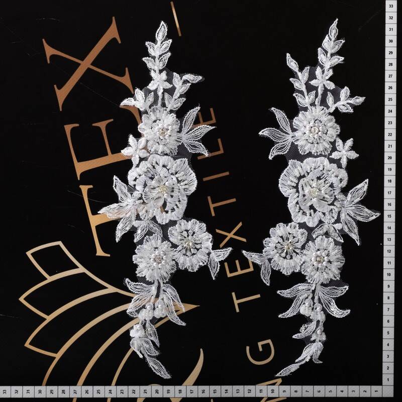 Аппликация в белом цвете, расшитая бисером и жемчужинками, с оригинальными серединками цветов, создает изысканный и элегантный декор. Красиво украшенные детали придают изделию неповторимый и стильный вид. Аппликация идеально подходит для совершенствования свадебных платьев, вечерних нарядов или создания уникальных аксессуаров. Приблизительный размер - 12х32 см.