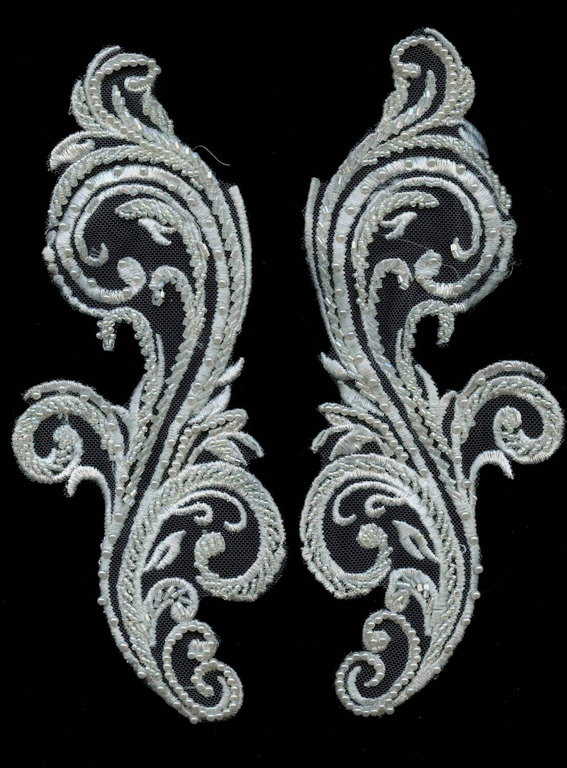 Расшитая аппликация в молочном цвете. Использование бисера и жемчуга придает изделию неповторимости и изящества. А завитки в дизайне аппликации придают ей эффектности и роскоши, создавая впечатление утонченного декора. Приблизительный размер - 8х24 см.