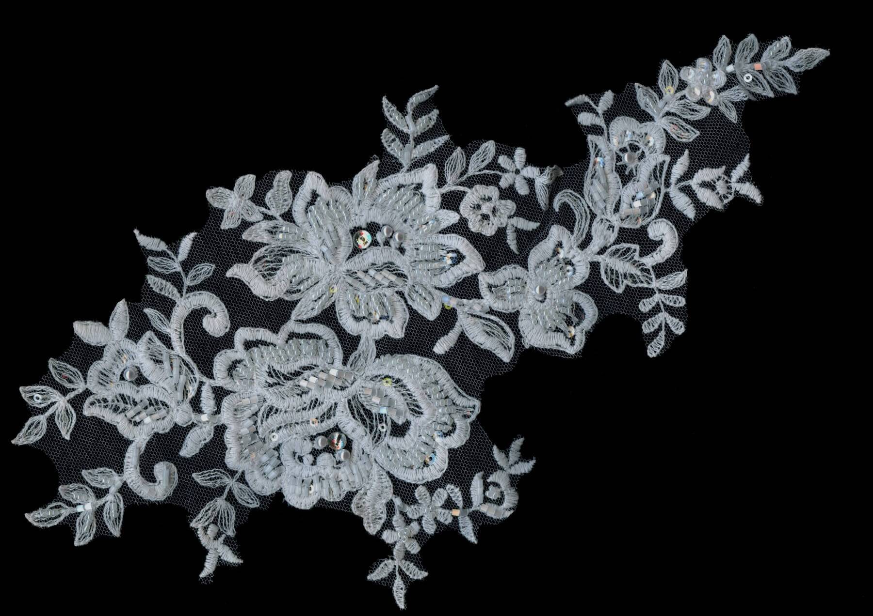 Аппликация в белом цвете, украшенная бисером и незначительным количеством жемчуга. Идеально подойдет для декорирования свадебных платьев, вечерних нарядов или создания уникальных аксессуаров, где важен тонкий и стильный декор. Приблизительный размер - 14х31 см.