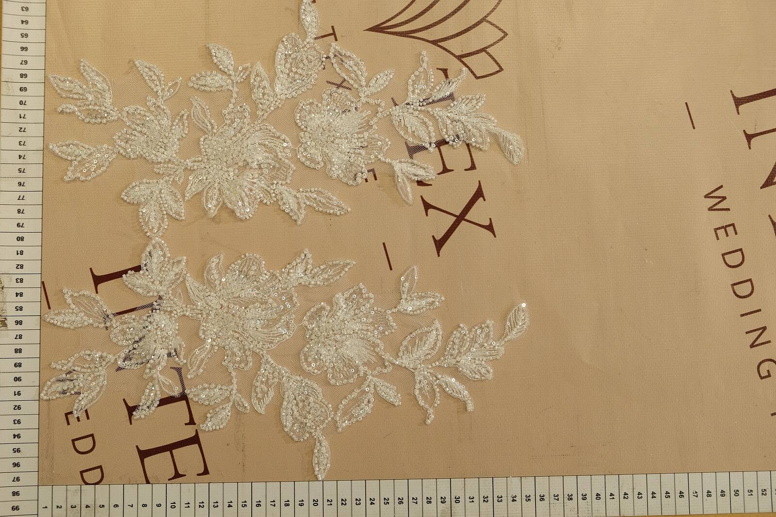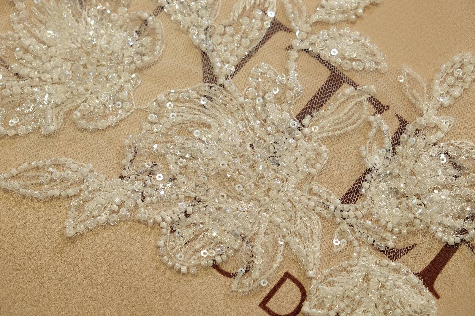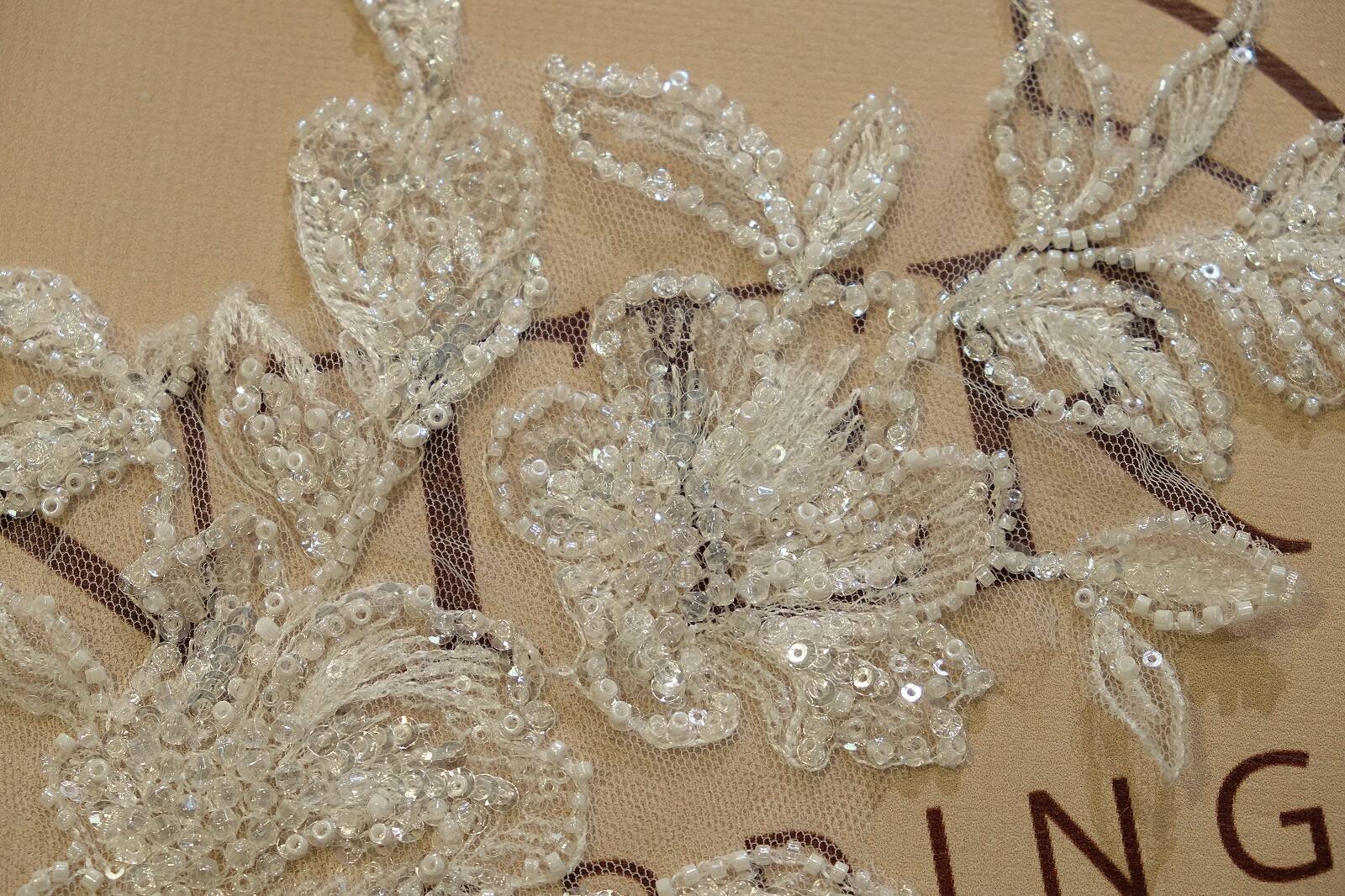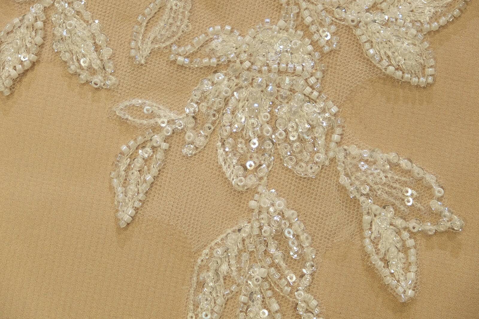 Расшитая аппликация - изящный декоративный элемент, выполненный на прозрачной основе из мягкой сеточки, которая легко интегрируется в ткань любой фактуры. Рисунок в виде цветов с листьями оформлен в изысканном стиле. Композиция расшита различными видами бисера и пайеток, создающих игру света и придающих мерцающий эффект. Изделие имеет молочный оттенок, что делает его универсальным для свадебного и вечернего наряда. Такая аппликация прекрасно подходит для отделки лифов, рукавов, спинок платьев или вуалей. Она добавляет образу утонченности, женственности и эксклюзивности.