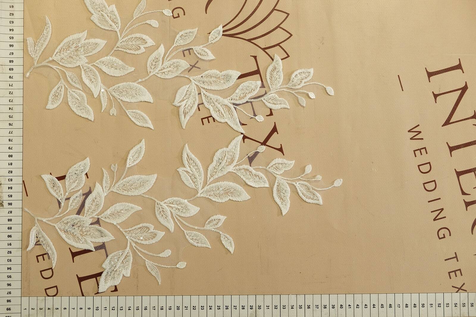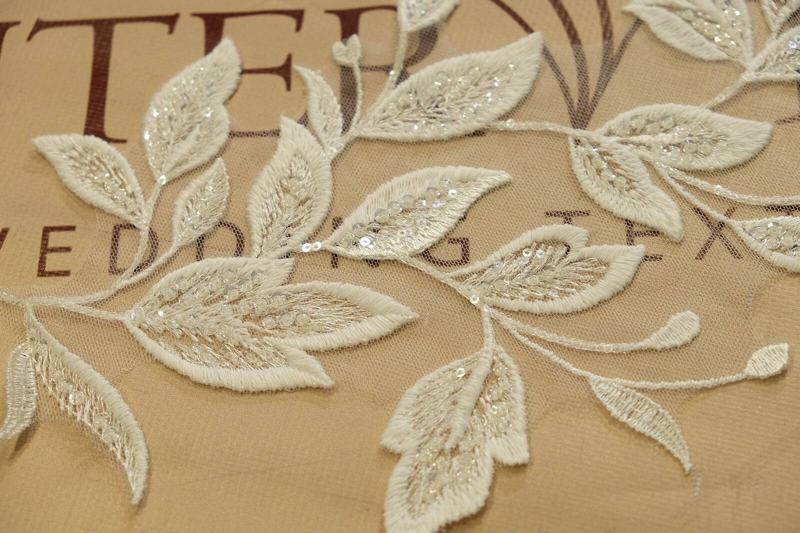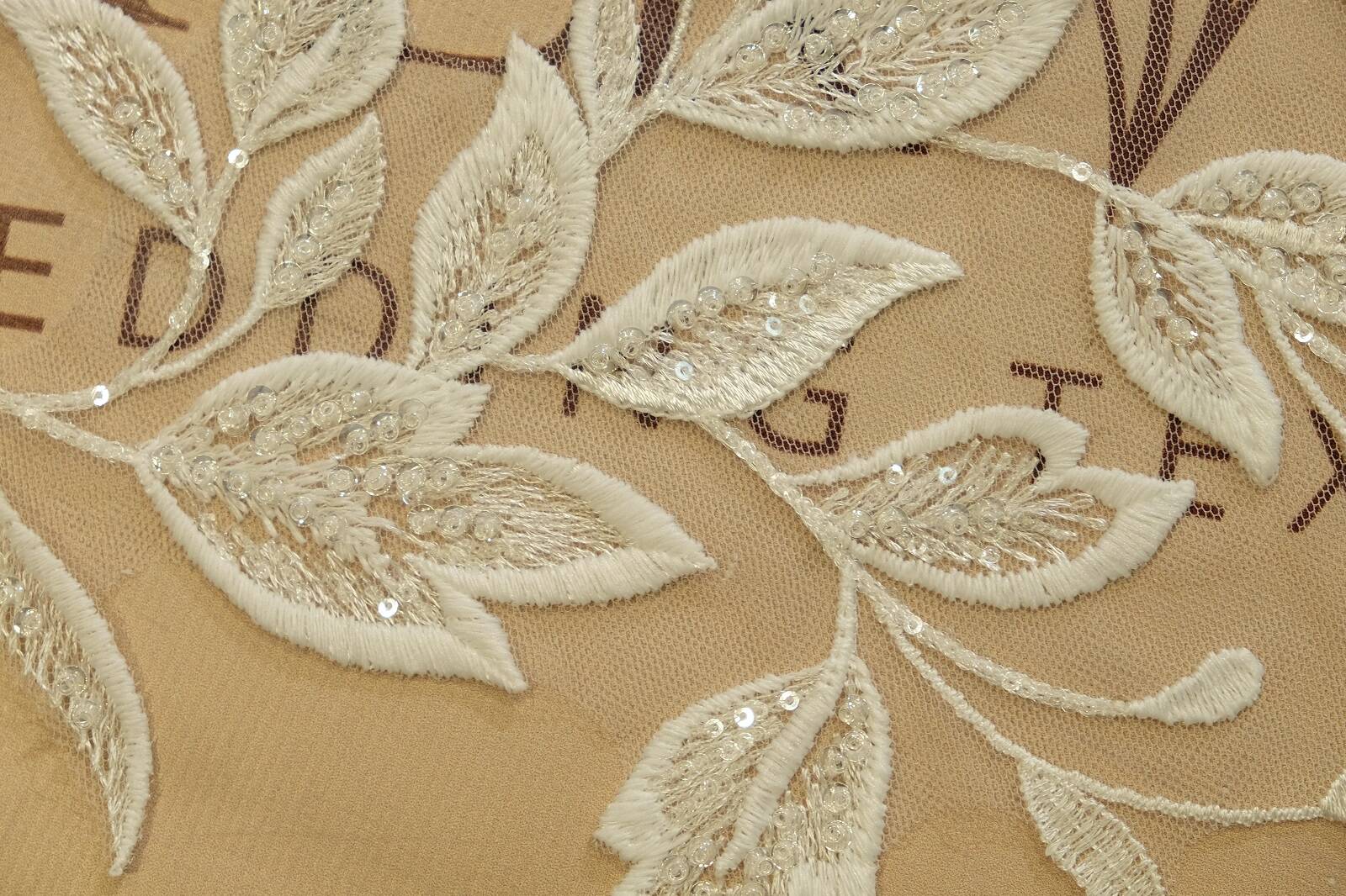 Расшитая аппликация создана на прозрачной сетчатой основе, что делает ее почти незаметной на коже или ткани. Рисунок в виде веточек с листьями выполнен нитками и украшен блестящими пайетками и бисером. Такой элемент прекрасно подходит для отделки свадебных платьев, корсетов, рукавов или вечернего наряда. Аппликацию легко нашить вручную или машинной строчкой. Ее главные преимущества - легкость, деликатность, гармоничное сочетание текстур и акцент на деталях.