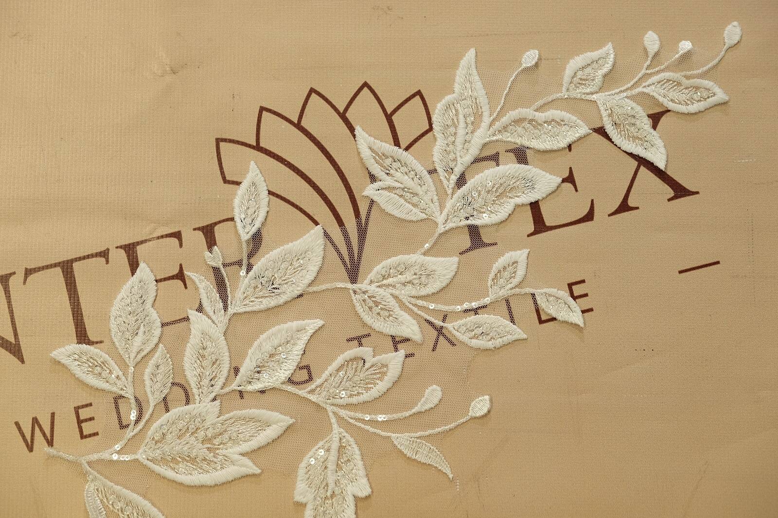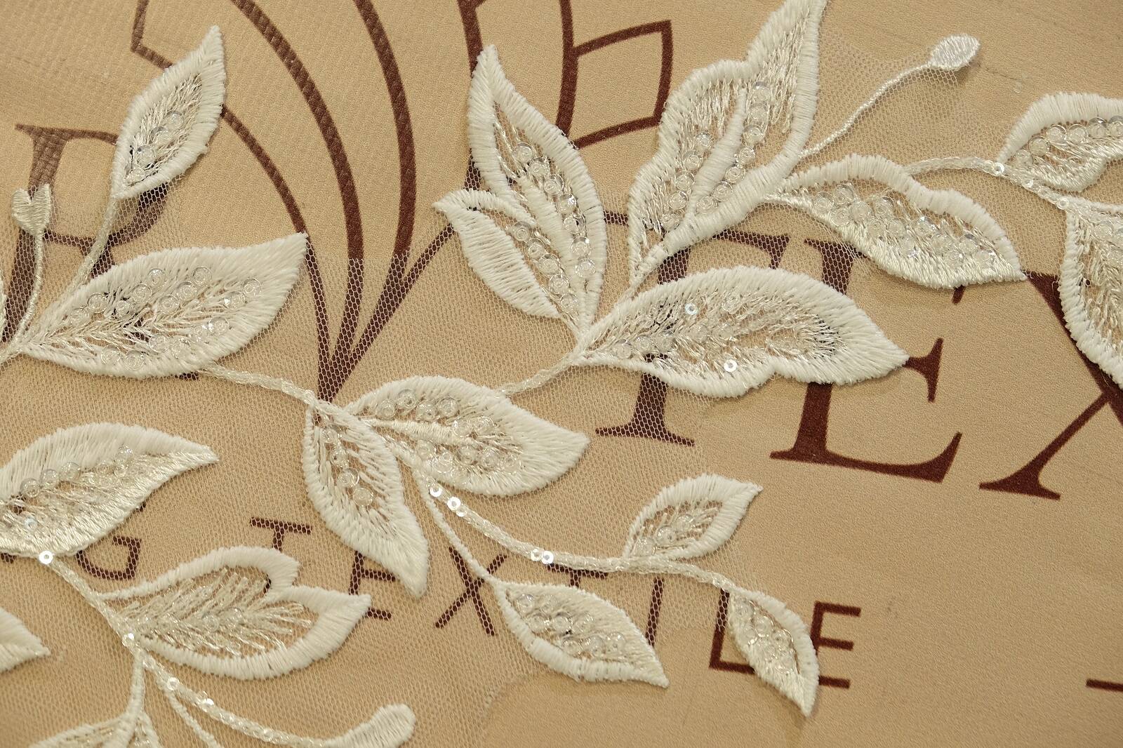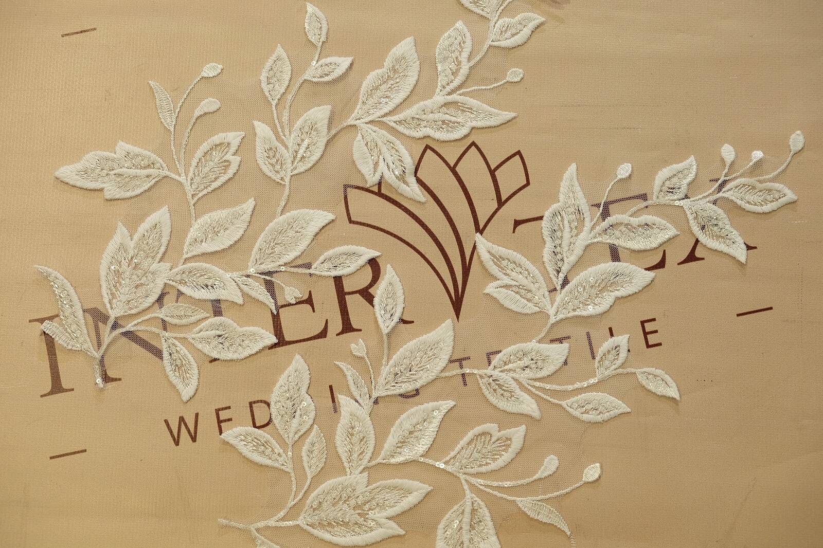 Расшитая аппликация создана на прозрачной сетчатой основе, что делает ее почти незаметной на коже или ткани. Рисунок в виде веточек с листьями выполнен нитками и украшен блестящими пайетками и бисером. Такой элемент прекрасно подходит для отделки свадебных платьев, корсетов, рукавов или вечернего наряда. Аппликацию легко нашить вручную или машинной строчкой. Ее главные преимущества - легкость, деликатность, гармоничное сочетание текстур и акцент на деталях.