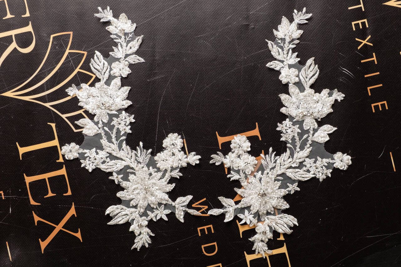 Аппликация густо расшита бисером. Узор - большие и маленькие цветы. Добавьте эту аппликацию на свадебное платье или вечерний наряд для создания элегантного и стильного образа. Также ею можно украсить текстильный аксессуар. Приблизительный размер - 33х20см.