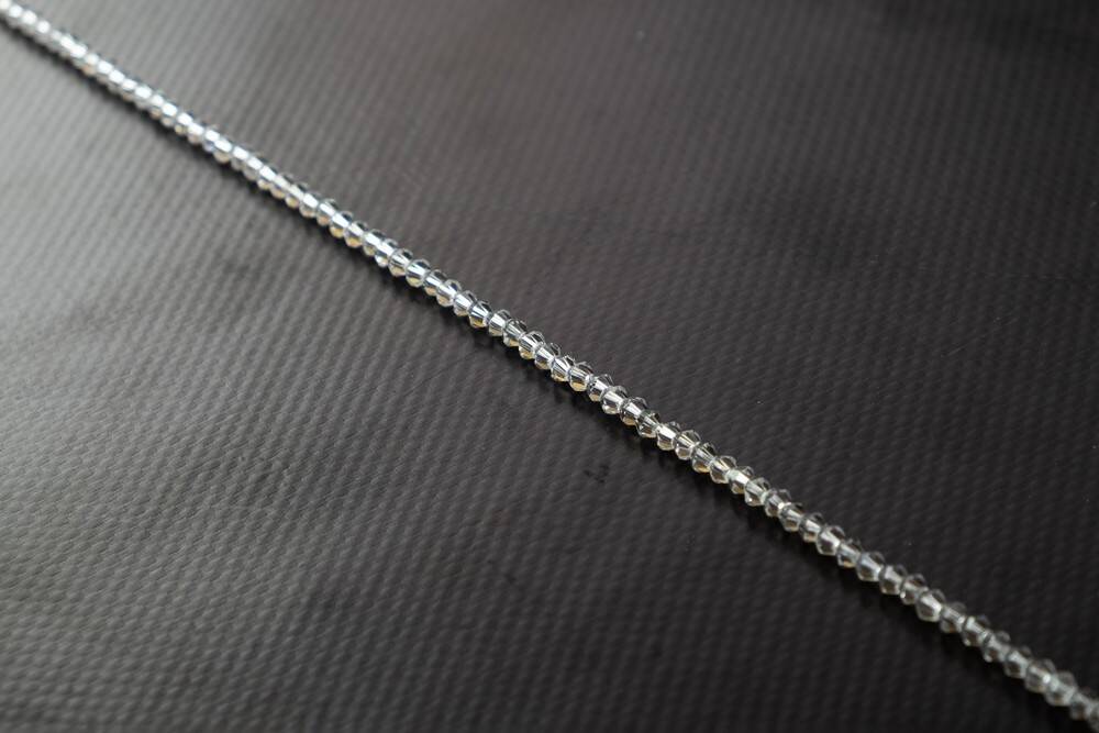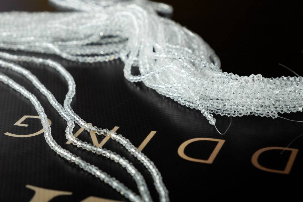 Beads on a string are a decorative accessory consisting of transparent beads strung on a thread. This product is often used to decorate clothing, accessories, or interior decorative elements. Crystals add sparkle and elegance due to their ability to refract light, creating beautiful reflections. They can be used in needlework, to decorate evening dresses, stage costumes or wedding decor, etc. It is an integral element of most handmade jewelry (necklaces, bracelets, earrings, hairpins) and a unique material for the realization of creative ideas.