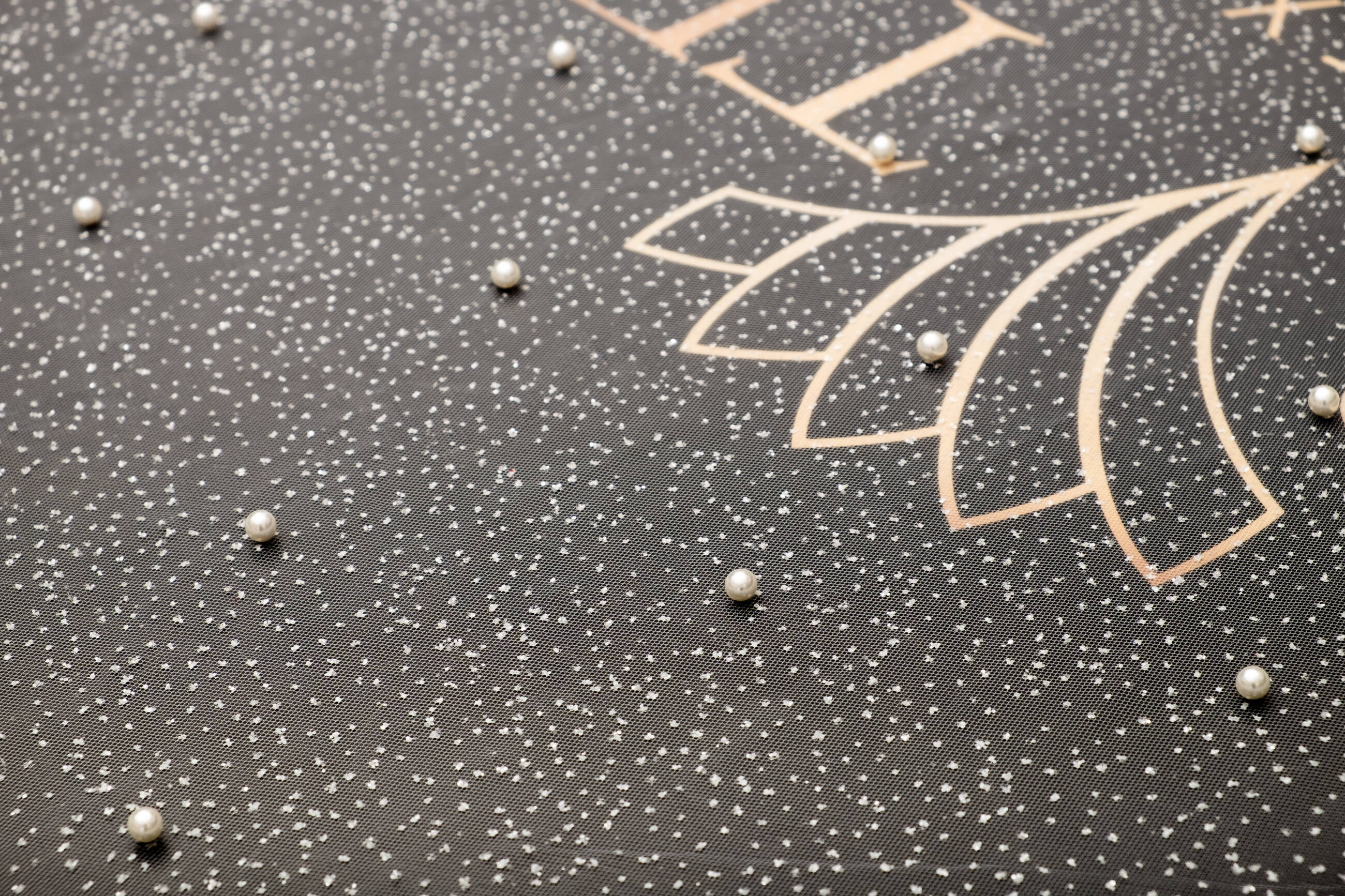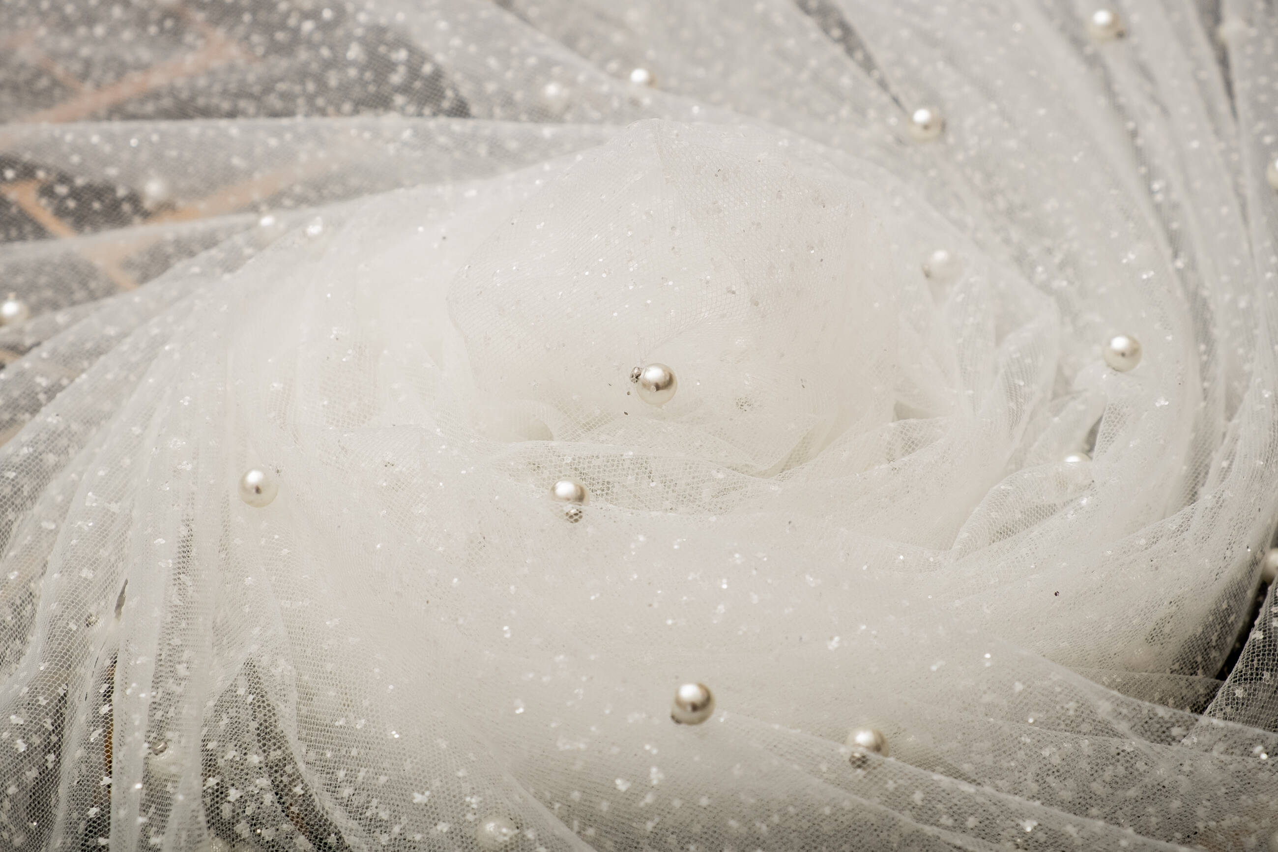 Transparent and lightweight mesh fabric, embroidered with pearls and covered with fine glitter. The material stretches a little in width, so it drapes well. The pearls are securely fastened with rivets to the Euro mesh, which makes the fabric durable and practical to use. It is easy to wash, does not wrinkle and does not require special care. It is ideal for creating prom and wedding dresses, skirts, corsets, as well as for decor. Glitter and pearls are a guarantee of exquisite taste, so they will always be in fashion and will be a great basis for a stylish look.