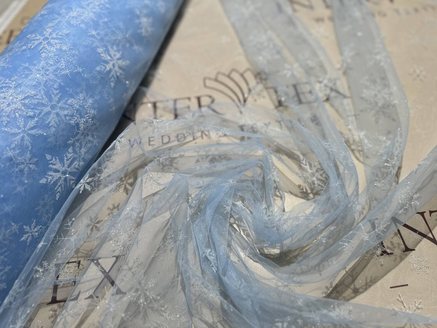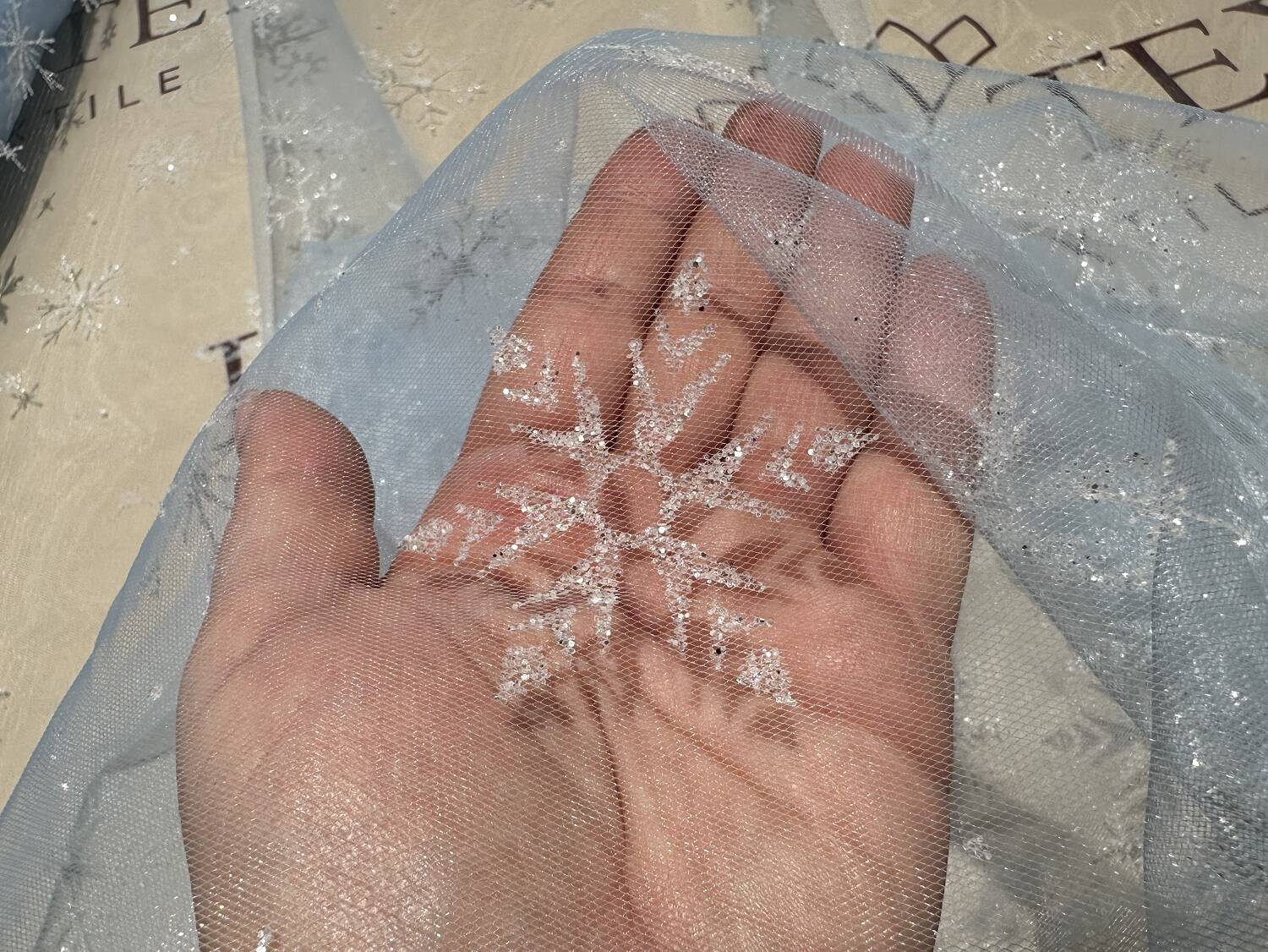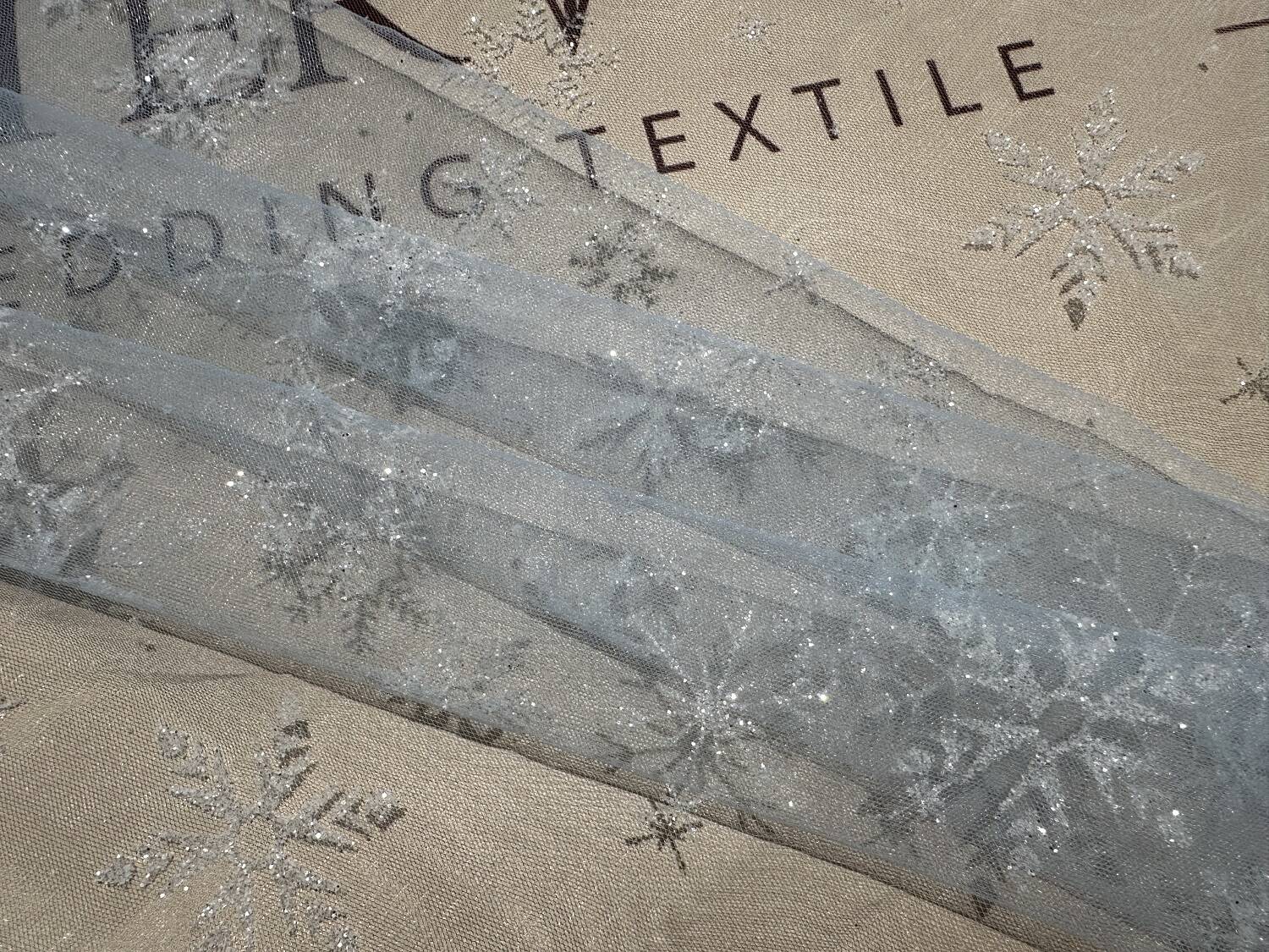 A thin, lightweight decorative fabric for creating vivid images. Almost transparent, created on the basis of a mesh with decorative elements in the form of snowflakes of various shapes and sizes, the mesh is also covered with glitter for a light shimmer.