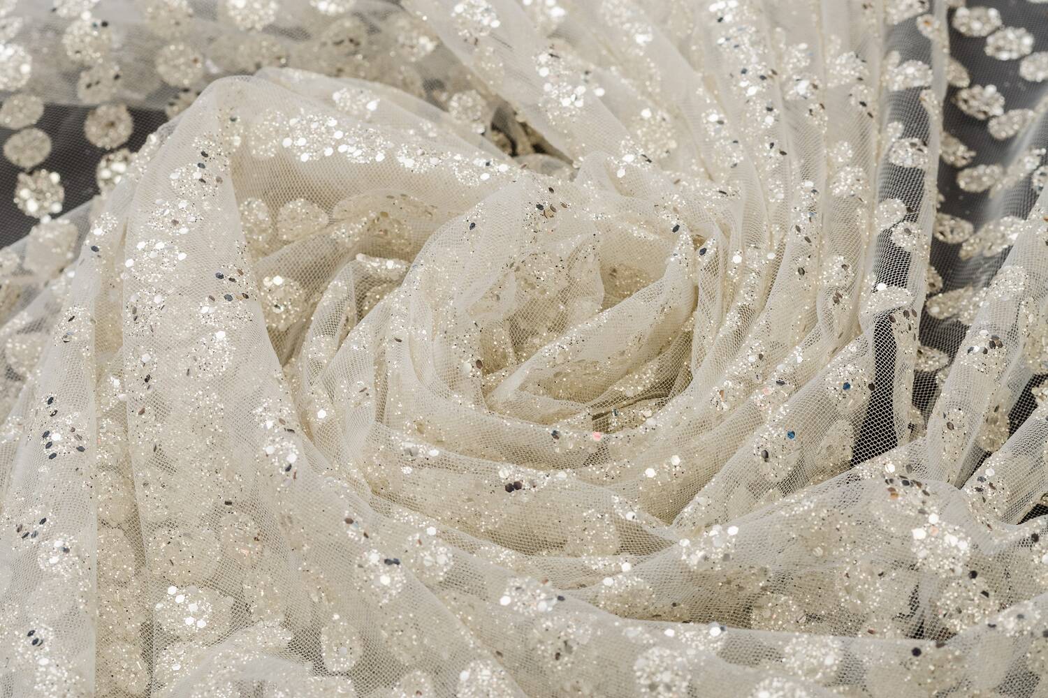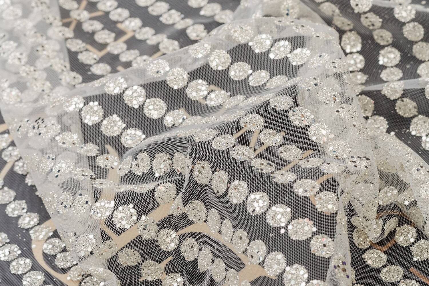 The mesh design is studded with circles of glitter, which are arranged in an even stripe across the entire metre and do not crumble. We recommend the glitter mesh for dressmaking or as an individual piece of decoration. Perfect for making spectacular wedding or evening dresses, corsets and skirts.