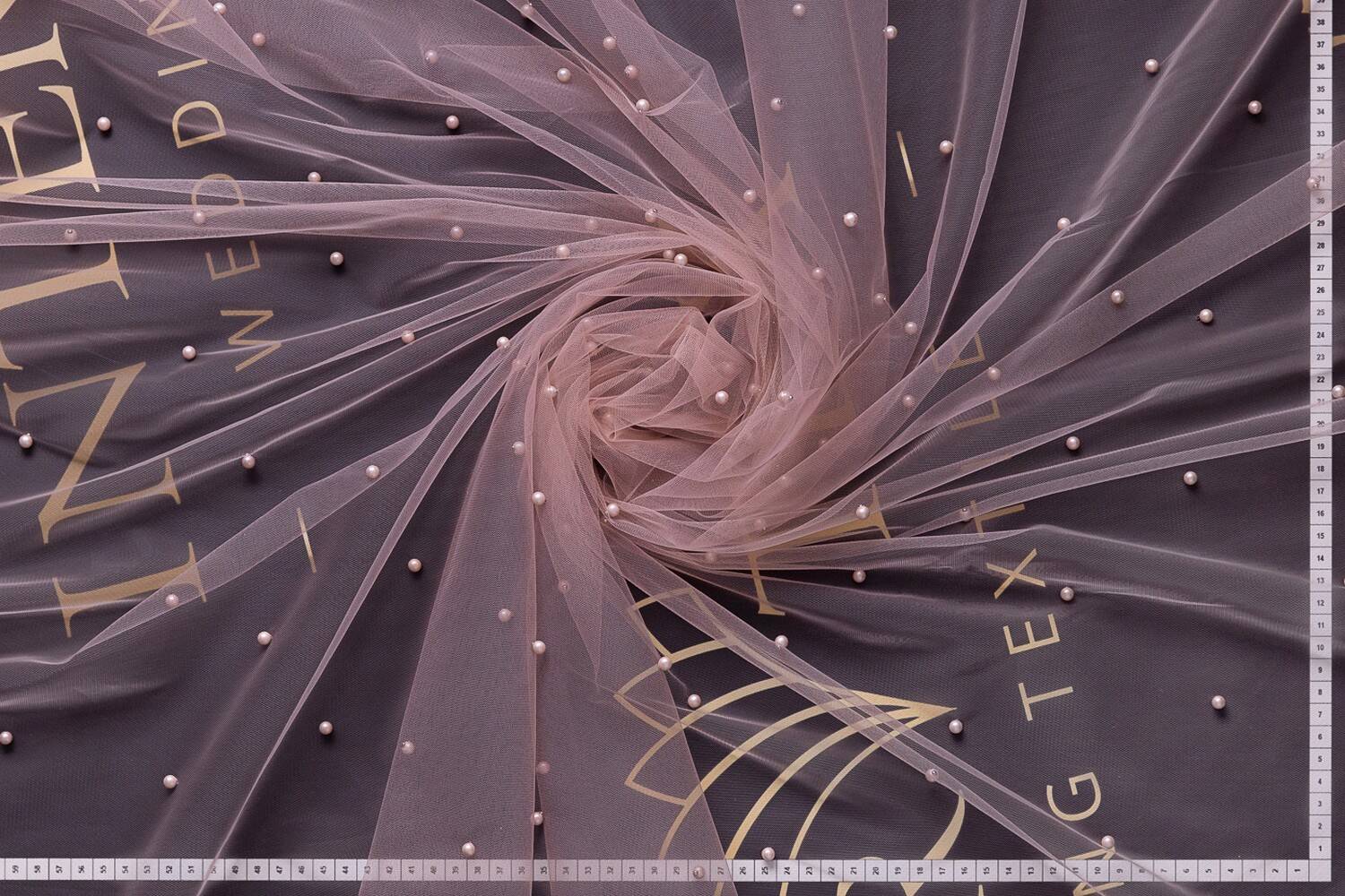 The pearl mesh is a sheer, lightweight fabric that stretches slightly in width. The front side is chaotically secured with powder-coloured pearls. The pearls are firmly attached. The fabric does not crumple and requires no special care. Pearl netting is suitable for evening gowns, as well as for decoration and decoration of banquet halls.