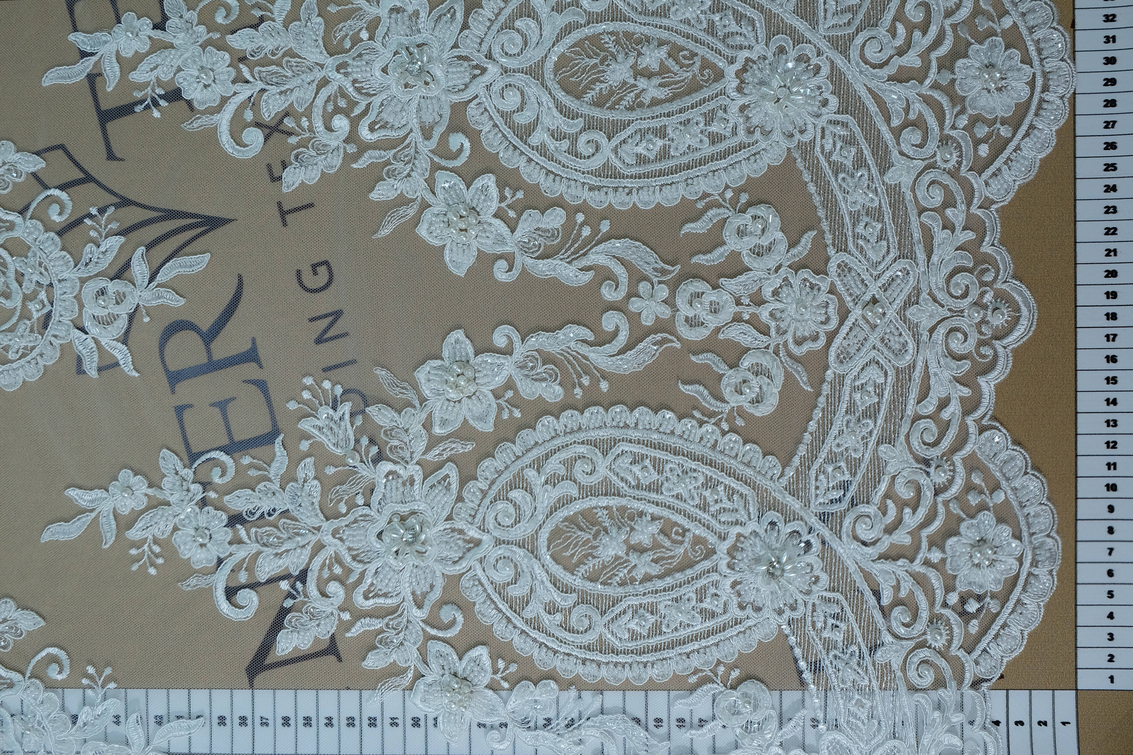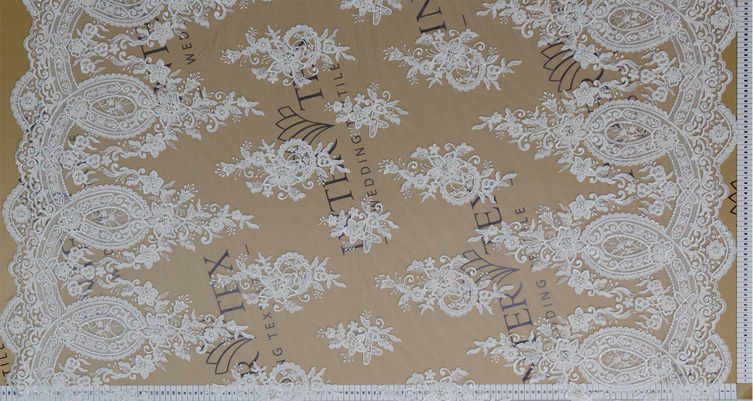 A corded and embroidered fabric is a delicate fabric with an exquisite design, widely used to create wedding dresses. It makes the bride's look light and solemn. The original pattern and brilliance of the decor perfectly emphasize all the advantages of the wedding dress and help to complete the wedding style.