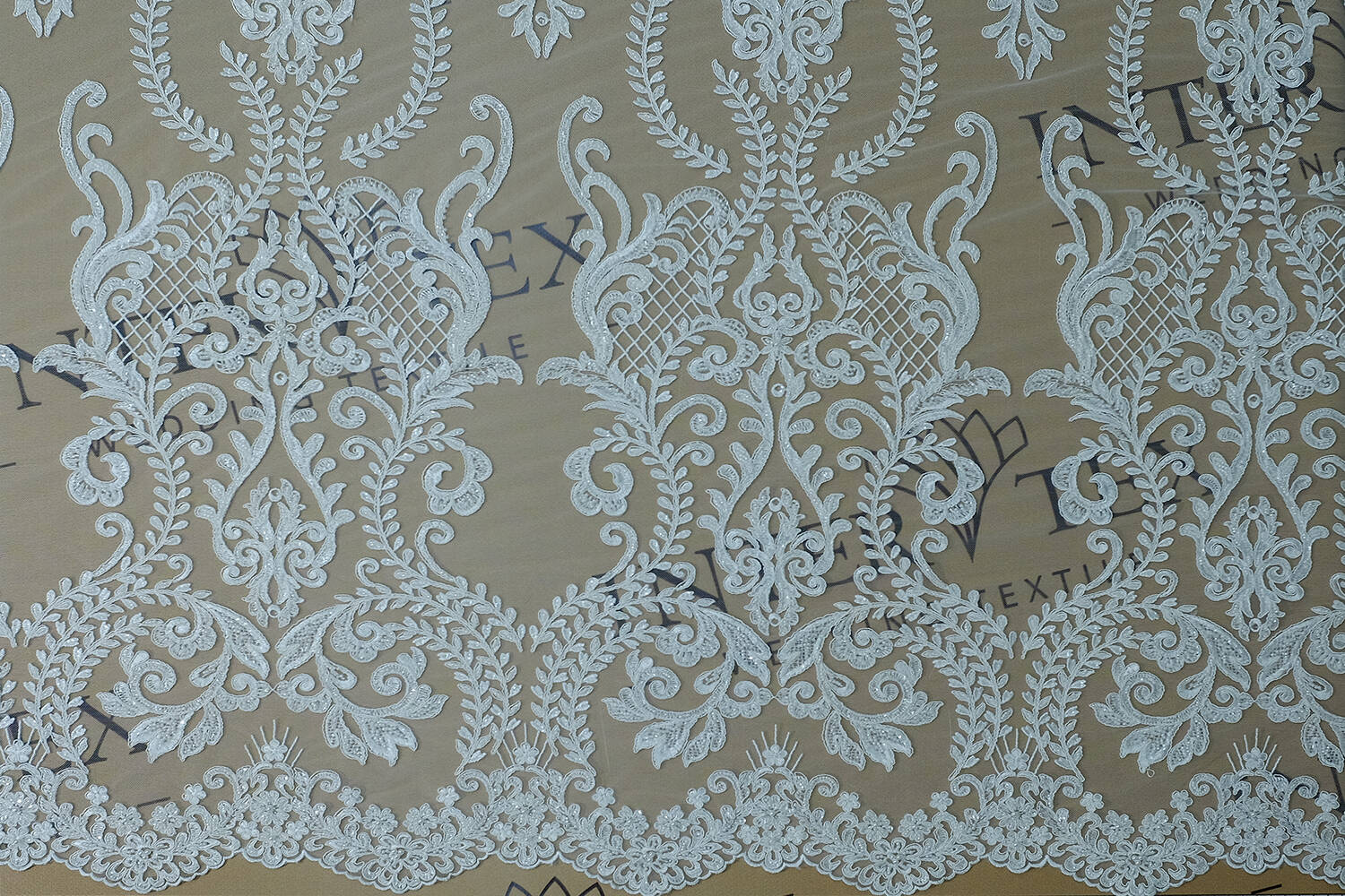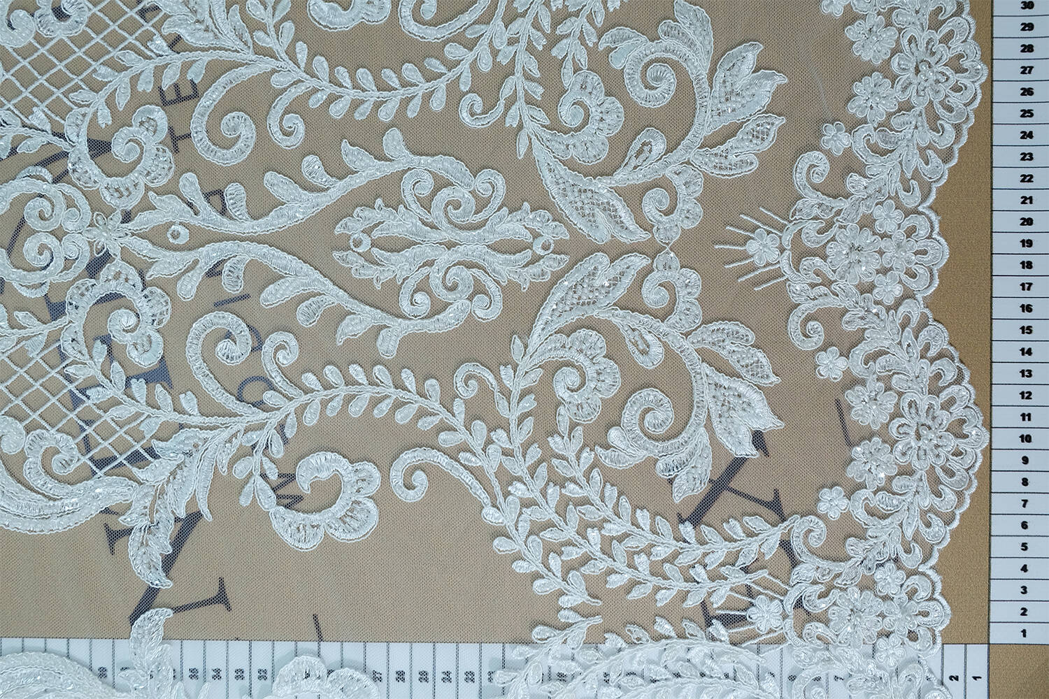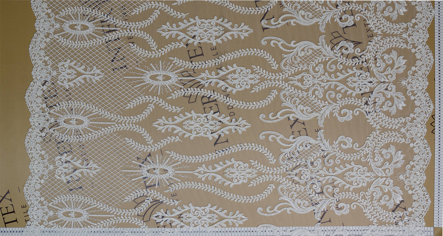 The canvas with cord and embroidery impresses with its pattern. Exquisite design and detailed cord work add volume and texture to the fabric, while beads and sequins add shine and elegance. Ideal for creating wedding dresses, evening wear and exclusive accessories.
