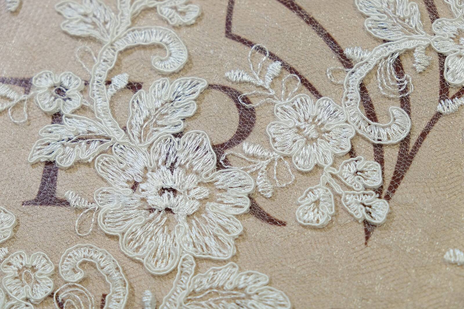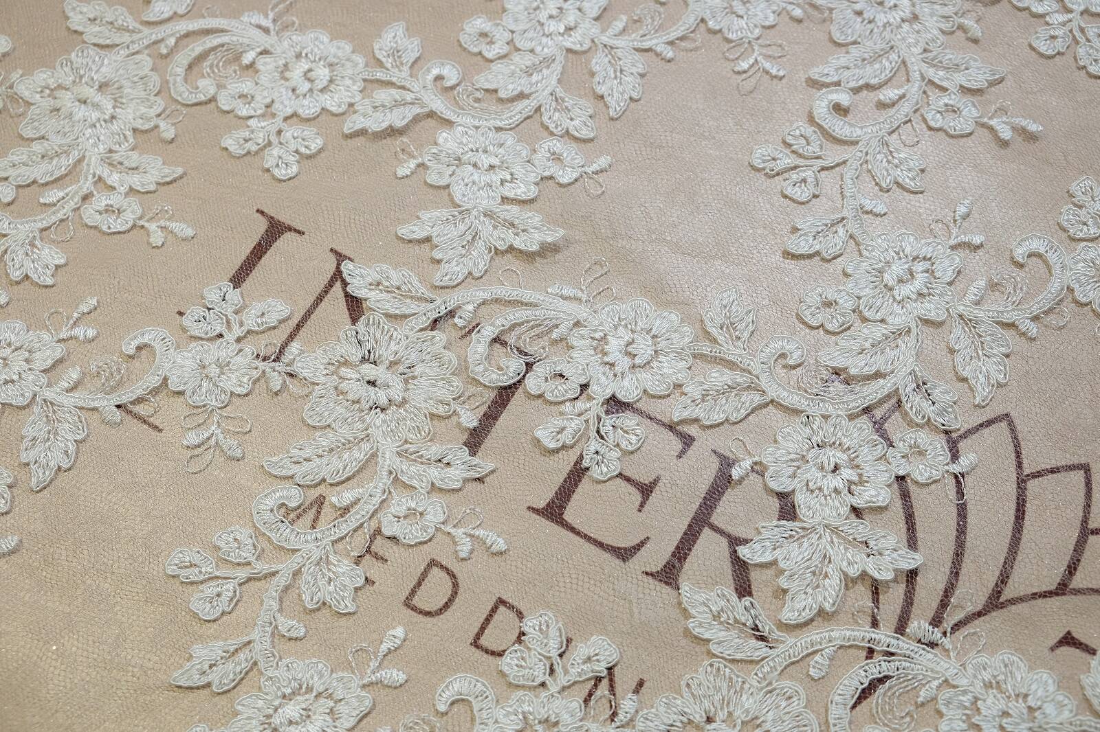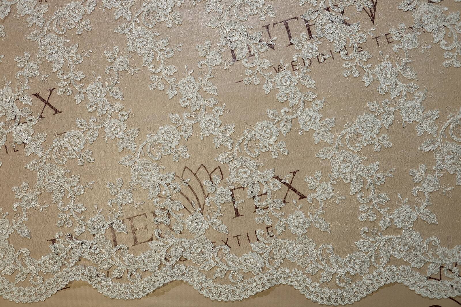 A luxurious lace fabric with a cord fascinates with its sophisticated design. The pattern consists of flowers intertwined with twigs and curls. The corded trim adds texture and expressiveness. Lace looks elegant and sophisticated. It adds a special charm to the products. The fabric can be used for sewing wedding and evening dresses, corsets, as well as for decorating sleeves, trains or inserts in outfits. The fabric is ideal for creating luxurious and romantic looks. It drapes well and goes well with other materials such as chiffon or satin. Thanks to the classic floral pattern, this lace will never lose its relevance.