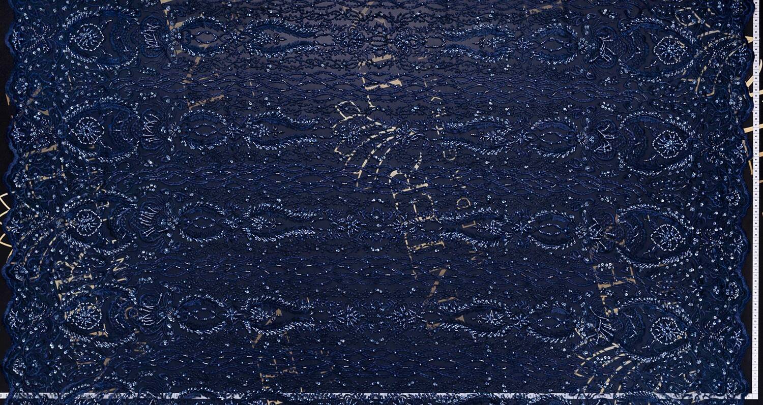 Embroidered lace fabric with rich ornamentation in navy blue color. It has a geometric and floral pattern that forms symmetrical exquisite compositions. The patterns are harmoniously intertwined in vertical and horizontal lines, creating a dynamic design. The transparent mesh adds lightness and provides convenience for use in clothing design. The edges of the fabric are decorated with a wavy edge, which allows it to be used without additional processing. Sequins and beads are laid out densely, creating a multifaceted shine under different lighting angles. This lace is ideal for evening and cocktail dresses, formal outfits, and for inserts in designer clothes.