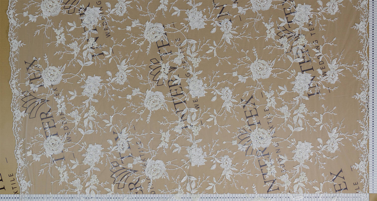 The lace fabric, decorated with beads and sequins, impresses with a delicate floral pattern spread over the entire surface. Carefully designed decor adds luxurious shine and texture to the fabric. Ideal for creating wedding dresses, evening wear and elegant accessories.