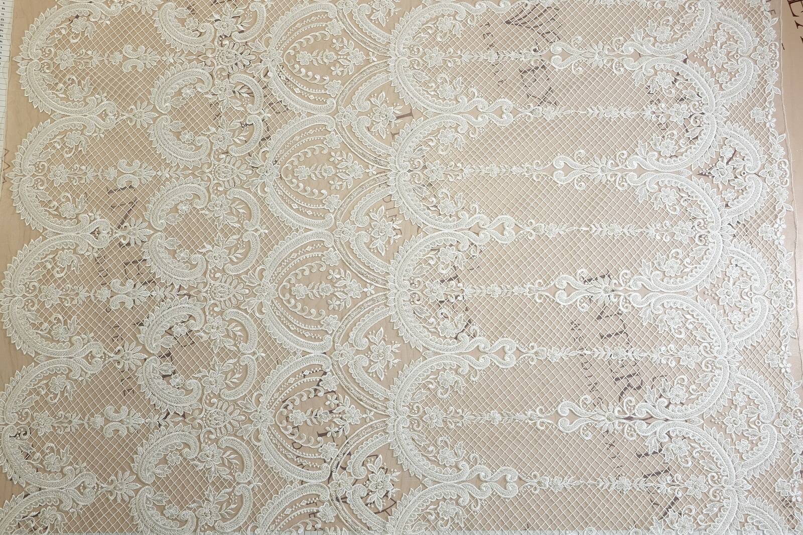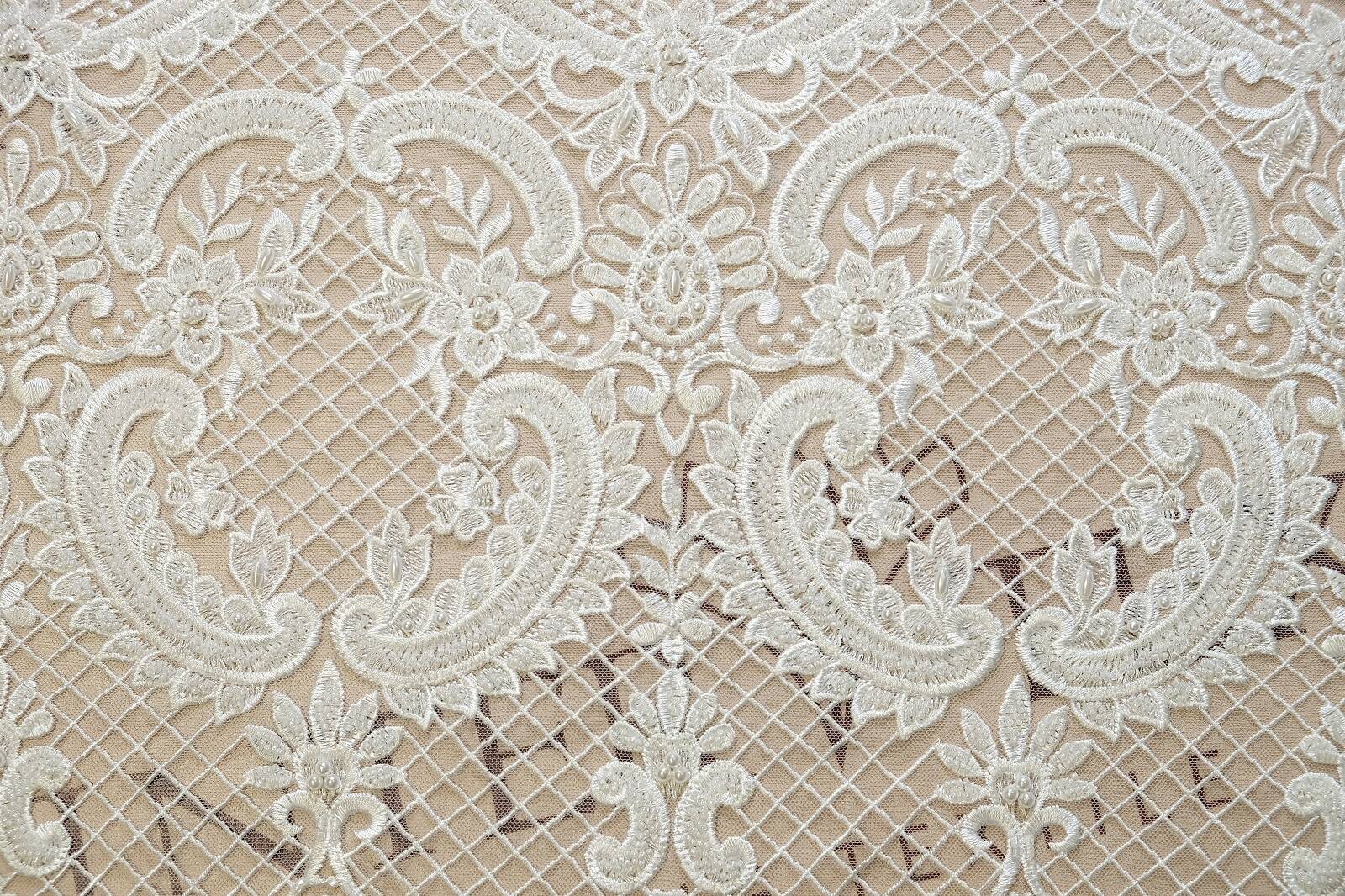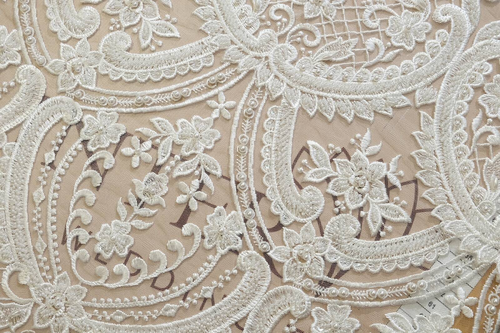 The embroidered lace fabric is made on a transparent mesh base. The main pattern is a combination of classic floral motifs with large curls, flowers and decorative mesh. The pattern is arranged symmetrically, forming repeating arches with an emphasis on the lower edge. The lace is decorated with glossy thread embroidery, beads and pearls that add shine. The texture is dense but flexible. The sophisticated design of the fabric makes it an ideal choice for creating wedding and evening dresses, corsets, skirts, sleeves or decorative inserts.