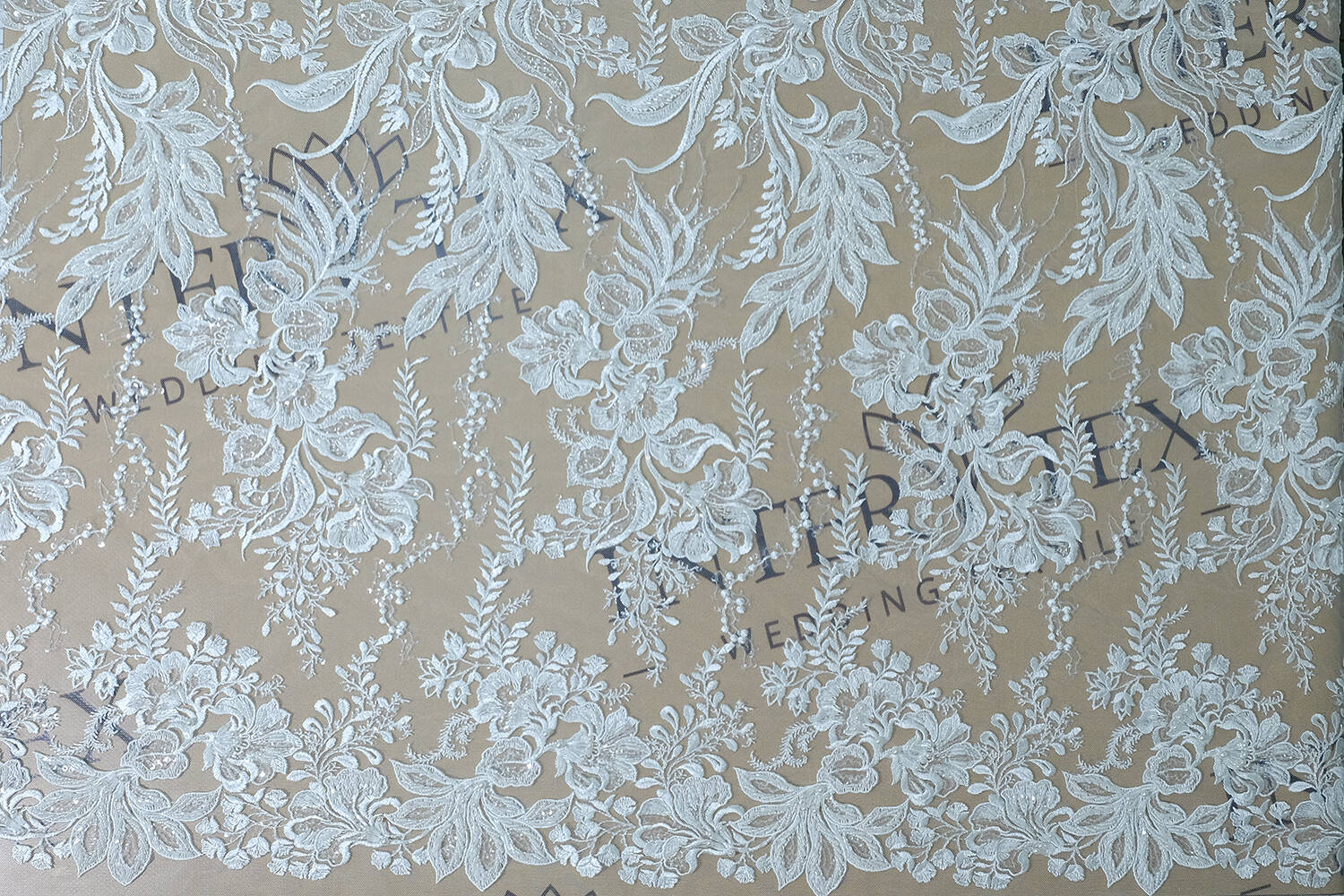 The embroidered lace fabric in milky color looks very elegant and luxurious. The lace background adds sophistication to the fabric, and embroidered floral motifs add romance and tenderness. The decor of various types of beads and sparkling sequins adds texture and shine, making the fabric ideal for creating wedding dresses, evening wear or decorative accessories. Each element of the embroidery is carefully thought out to create a harmonious and unique design.