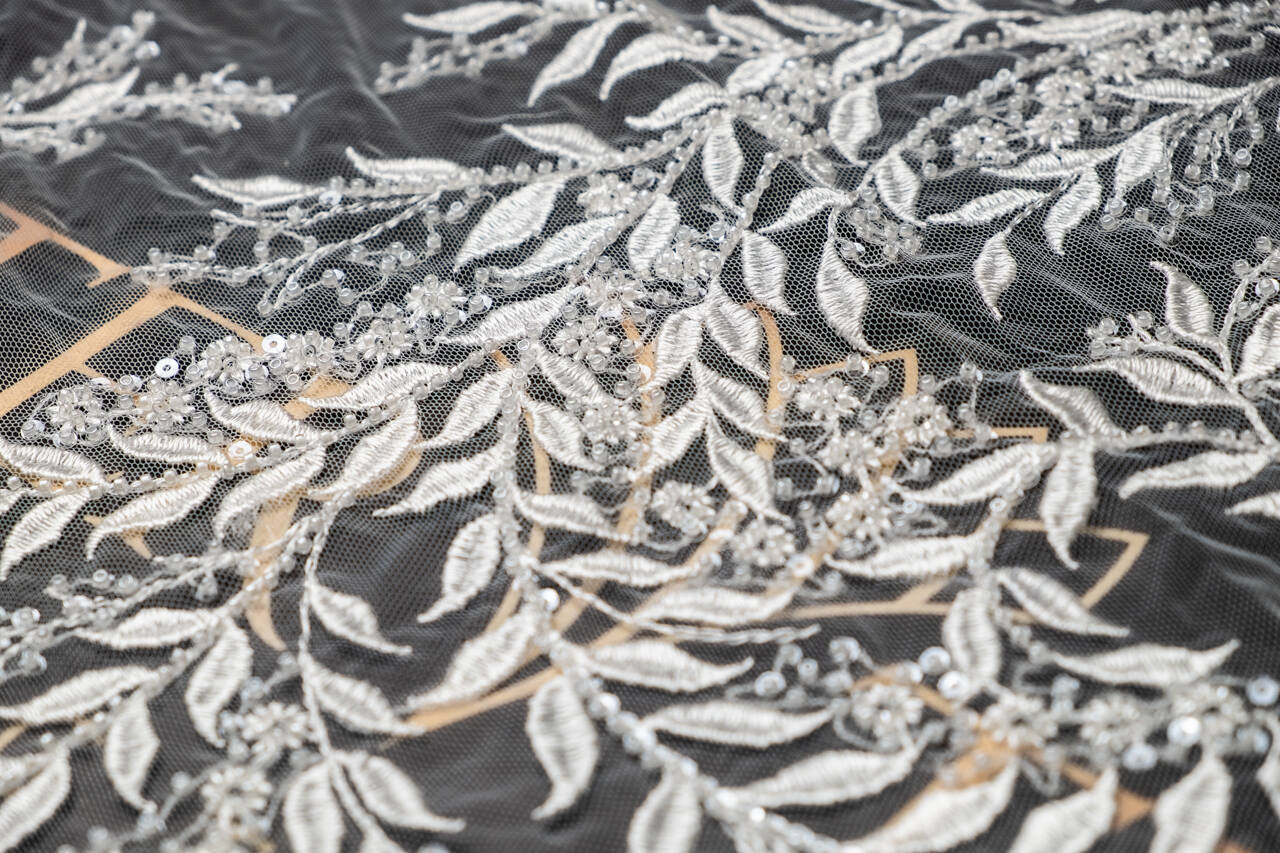 The lace fabric embroidered with beads and sequins looks incredibly elegant. The milky color adds tenderness and romance to the product, and the floral pattern creates the impression of sophistication and elegance. The material is ideal for making wedding dresses, evening dresses or decor. Every detail of the pattern makes the product unique and will make it a shining accent of look.