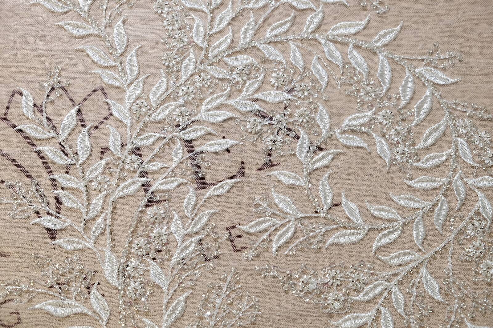 The lace fabric embroidered with beads and sequins looks incredibly elegant. The silver color adds tenderness and romance to the product, and the floral pattern creates the impression of sophistication and elegance. The material is ideal for making wedding dresses, evening dresses or decor. Every detail of the pattern makes the product unique and will make it a shining accent of look.