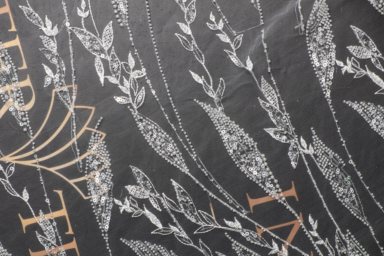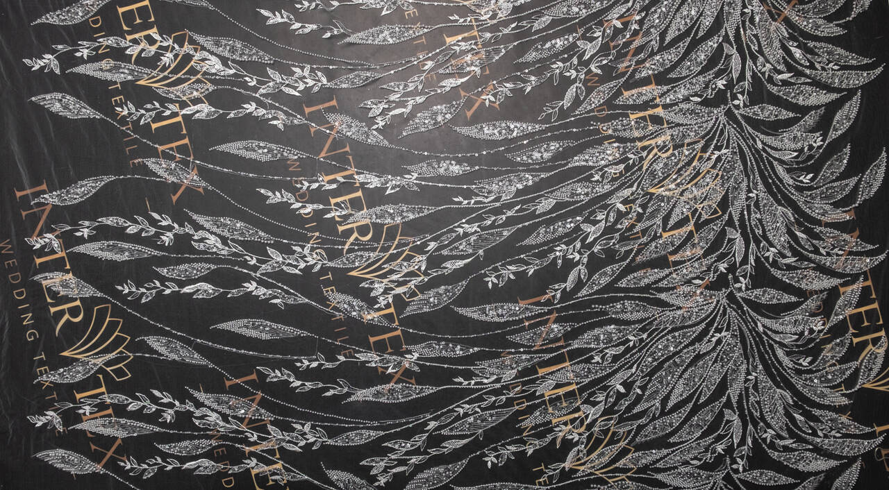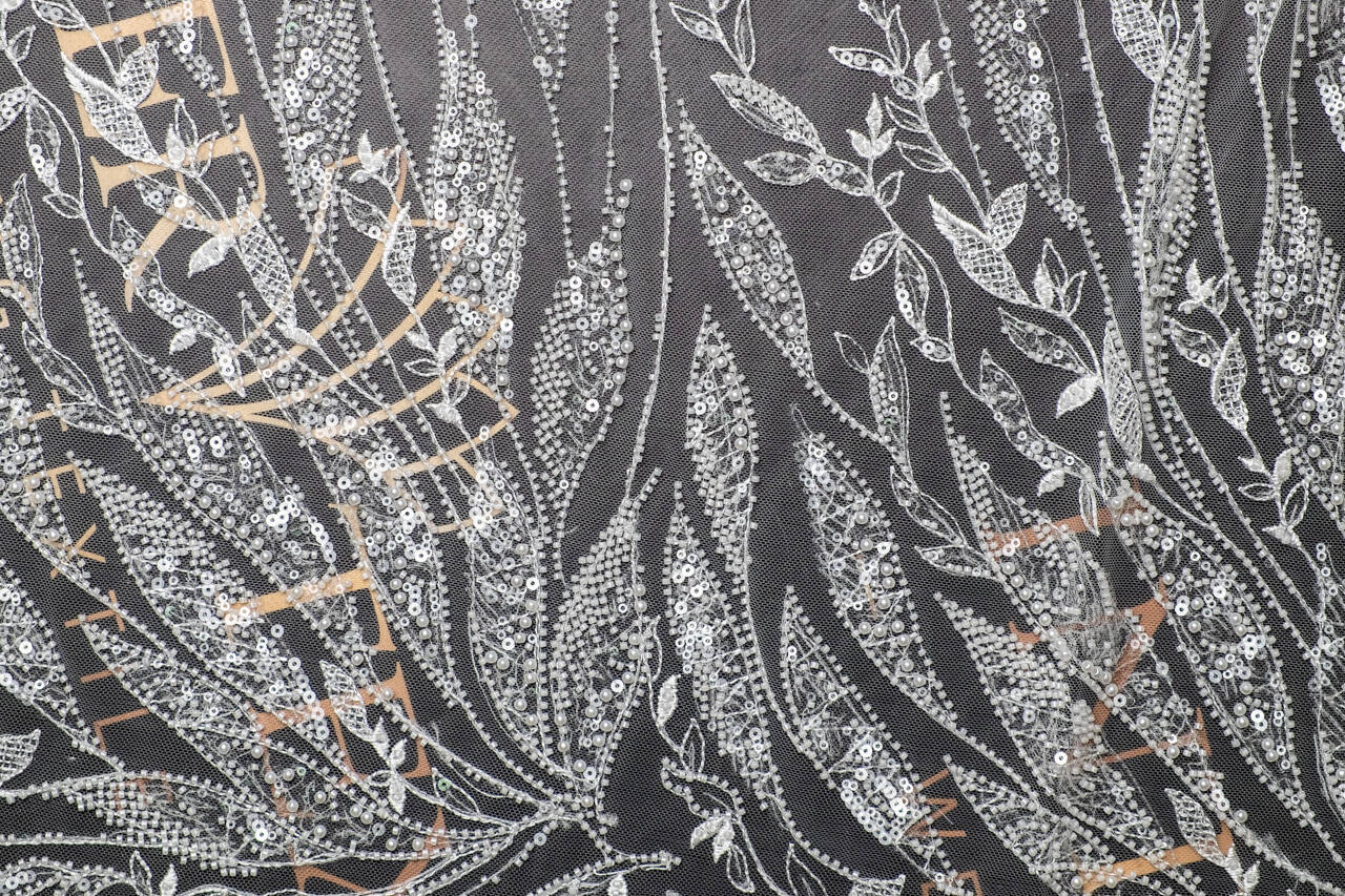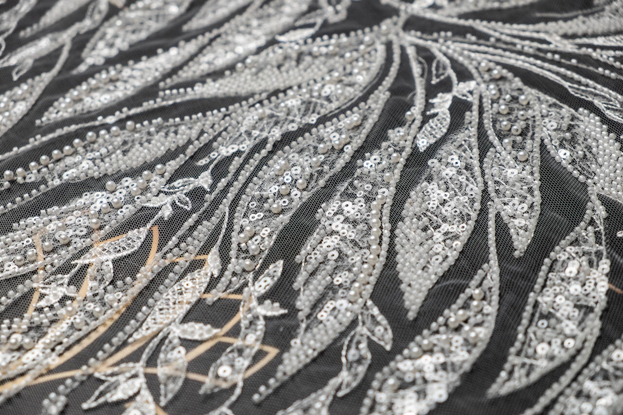 This delicate lace used on a thin canvas is ideal for creating wedding dresses. The material adds lightness and solemnity to the bride's look. An original pattern in the form of leaves, two types of sequins and pearls will add charm to the wedding dress and help complete the wedding look.