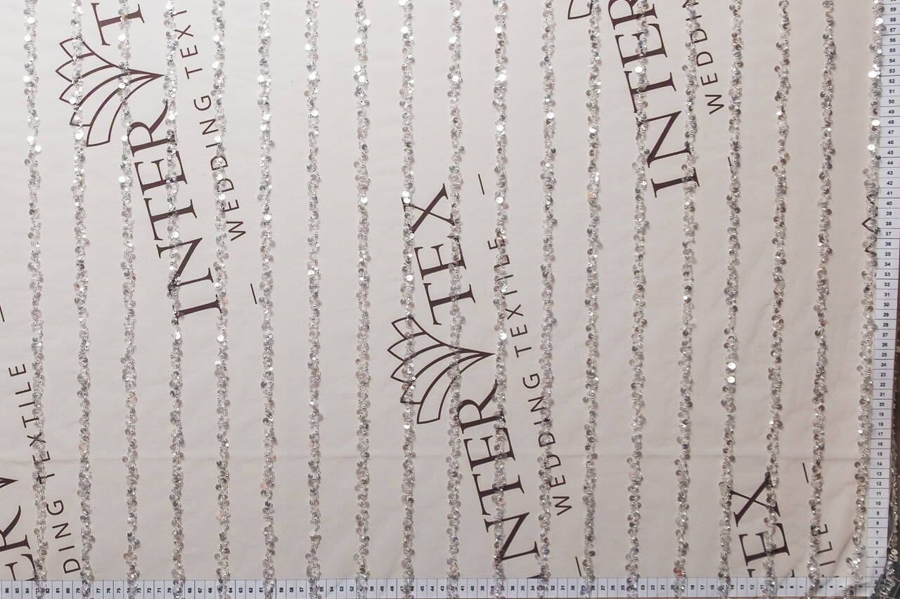 Lace fabric embroidered with sequins of various sizes and beads is an elegant textile material that impresses with its luxury and detail. Embroidered lace is often used to create wedding dresses, elegant clothes, decorative items, and accessories. This type of fabric is popular in the fashion industry and textile design because it adds subtlety, femininity and elegance to products.