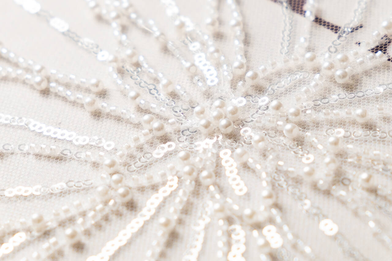 This delicate lace is ideal for creating wedding dresses. The material adds lightness and solemnity to the bride's look. The original pattern, pearls, sequins and beads on the fabric will add charm to the wedding dress and help complete the wedding look.