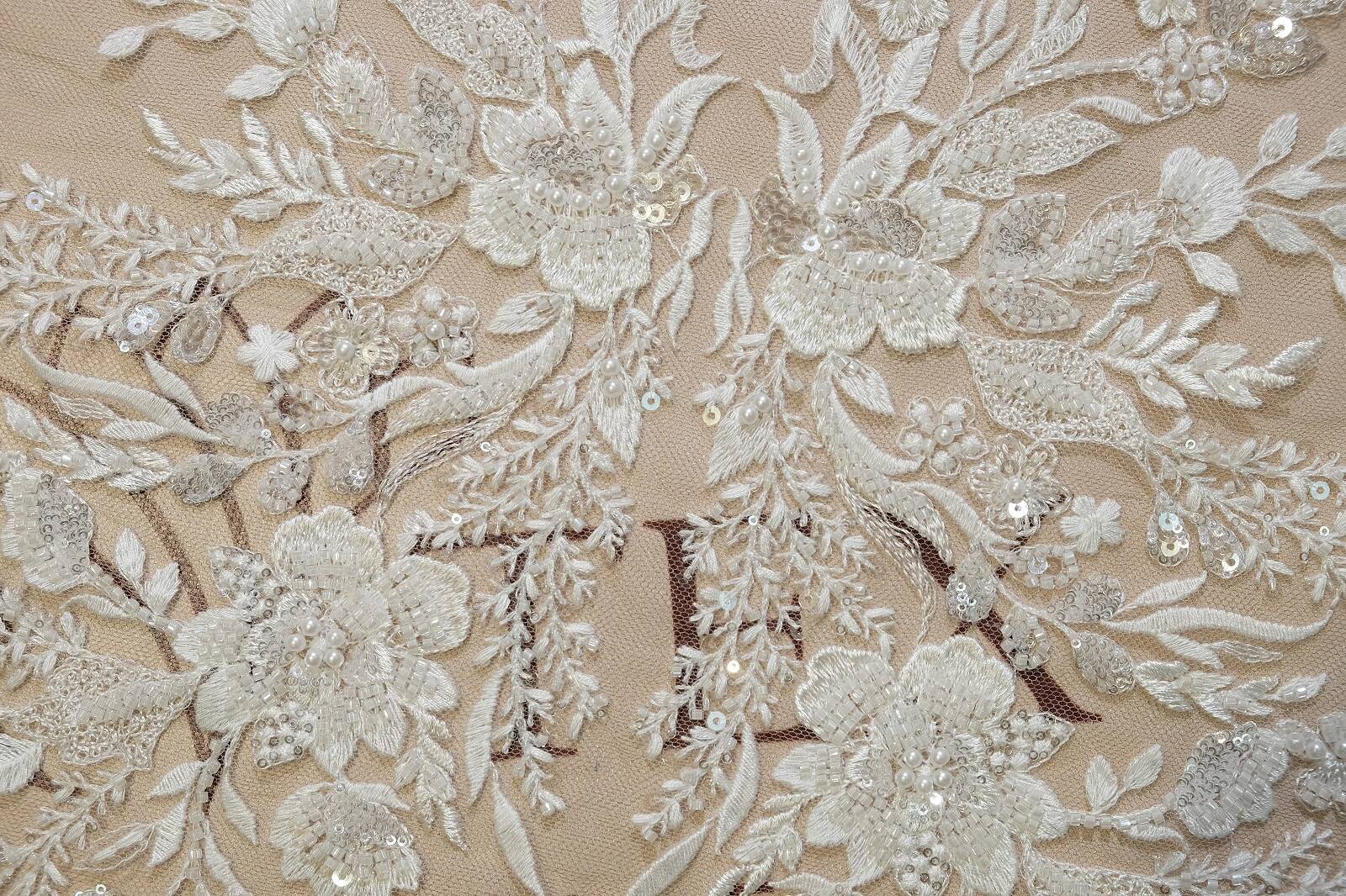 The lace fabric on a delicate mesh base is embroidered with elegant floral patterns. The decoration is made using thread embroidery and is complemented by sequins, beads and pearls that add shine to the fabric. Due to its structure, the lace fits perfectly on the fabric. It is ideal for creating wedding and evening dresses, corsets, capes, accessories, and can also be used to decorate blouses and skirts. Luxurious and elegant, this lace will be a wonderful accent to any sophisticated outfit.