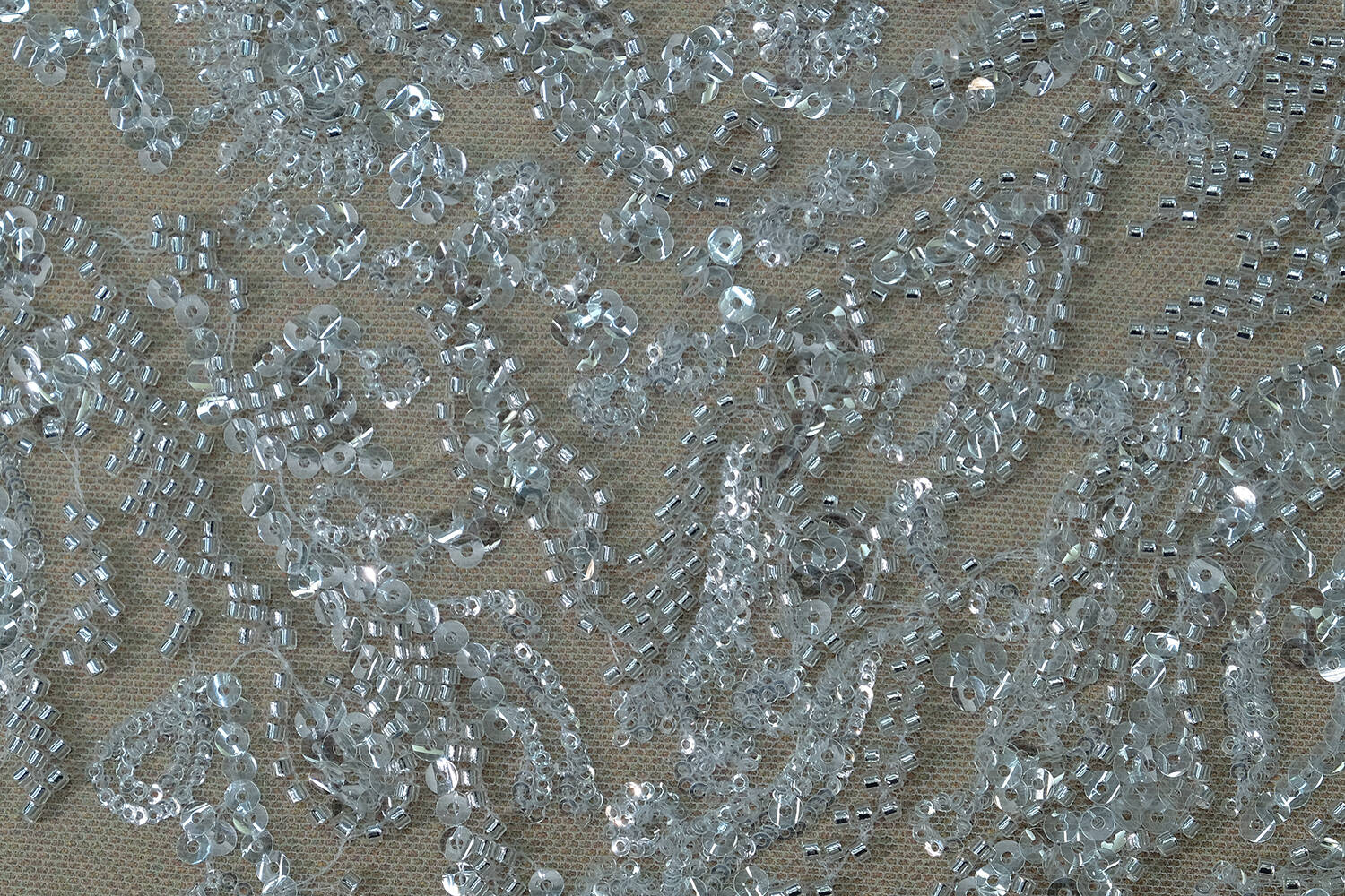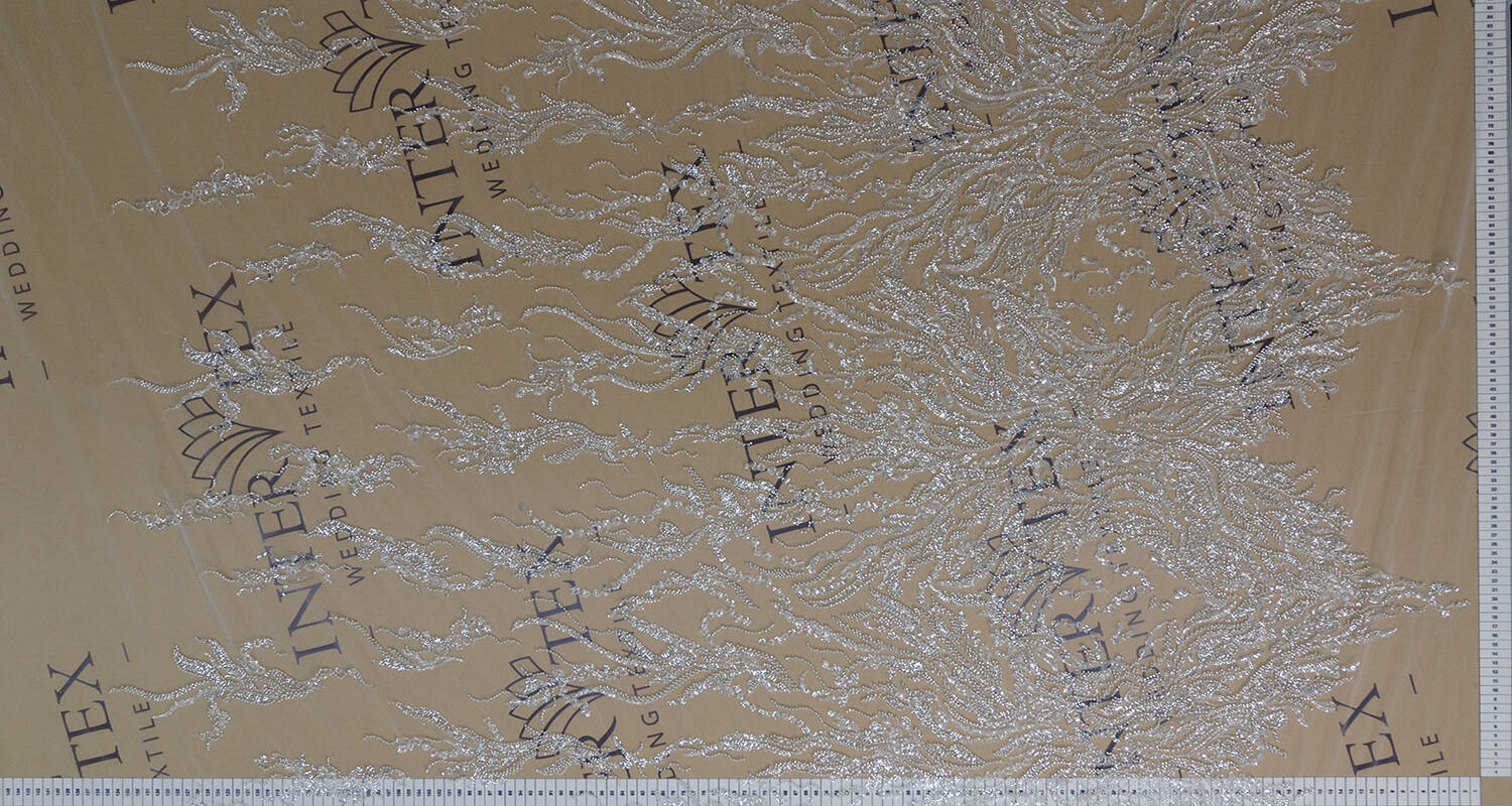 The lace fabric with an abstract pattern, decorated with beads and sequins, creates a rather elegant and stylish look. The decor on the fabric is uneven: on the one hand, it is denser, and on the other, it is less saturated. This adds dynamism and uniqueness to the fabric, making it ideal for creating fashionable clothes, festive outfits and original accessories.