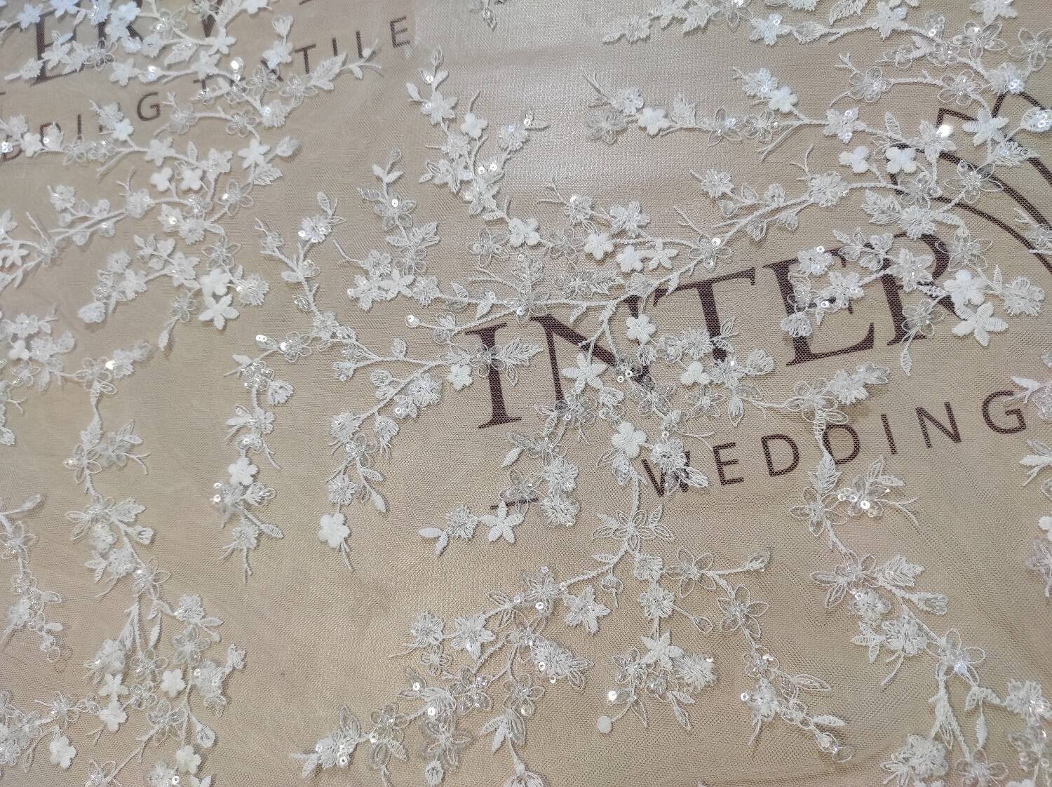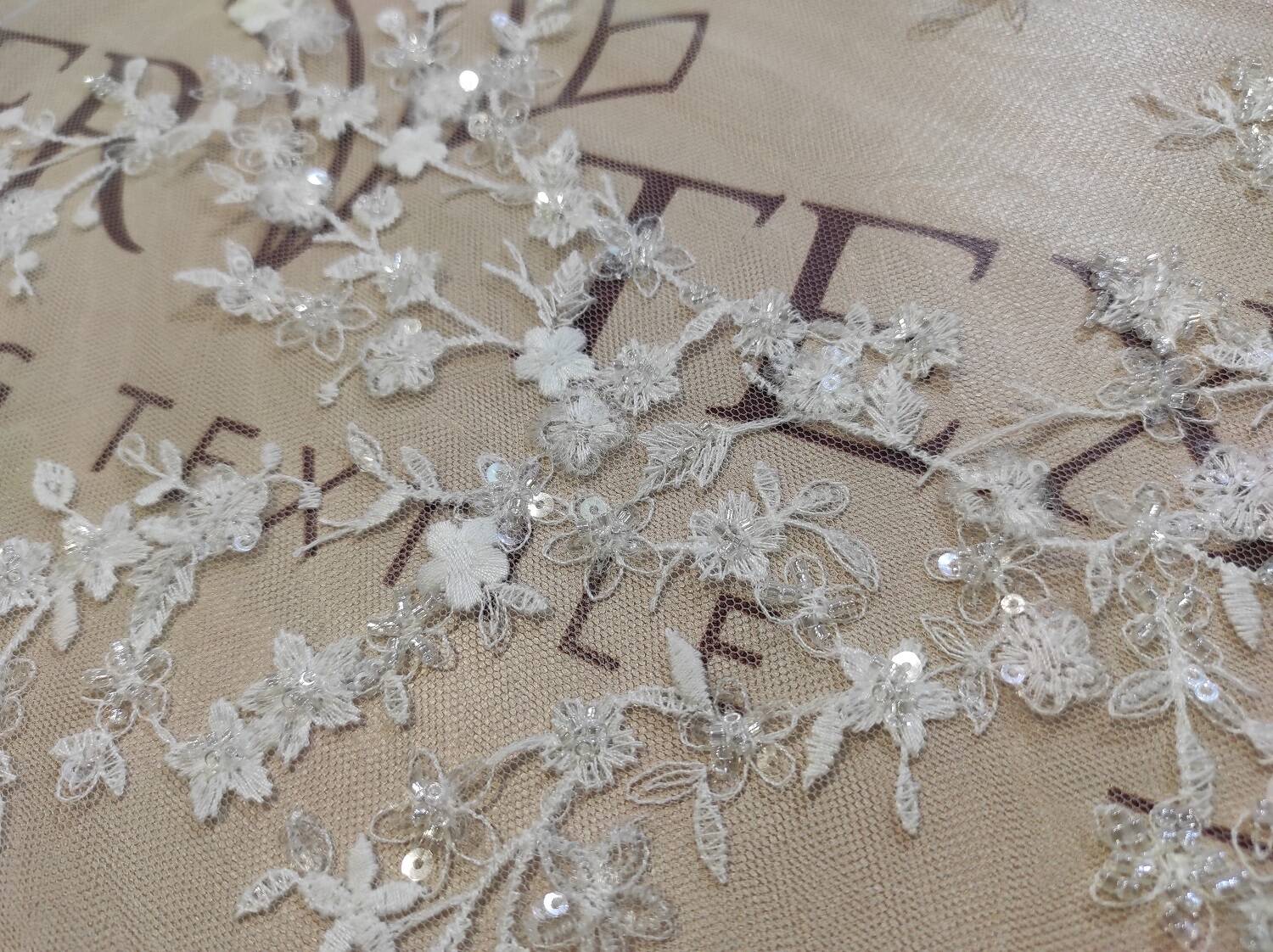 This exquisite lace fabric is created on the basis of a thin transparent mesh, which is decorated with delicate embroidery in the form of floral motifs. The lace is additionally decorated with sparkling sequins and beads that add to its elegance and luxurious look. Thanks to this design, the fabric looks exquisite and is ideal for creating evening and wedding dresses, accessories, and decorative elements.