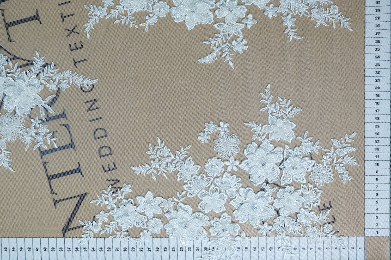 The milky-colored canvas with 3D flowers impresses with its luxury and elegance. The flowers are embroidered with beads and sequins, which adds shine and texture to them, and there are crystals in the middle of the flowers that give them a unique glow. The lace fabric is ideal for creating wedding dresses, evening wear and elegant accessories.