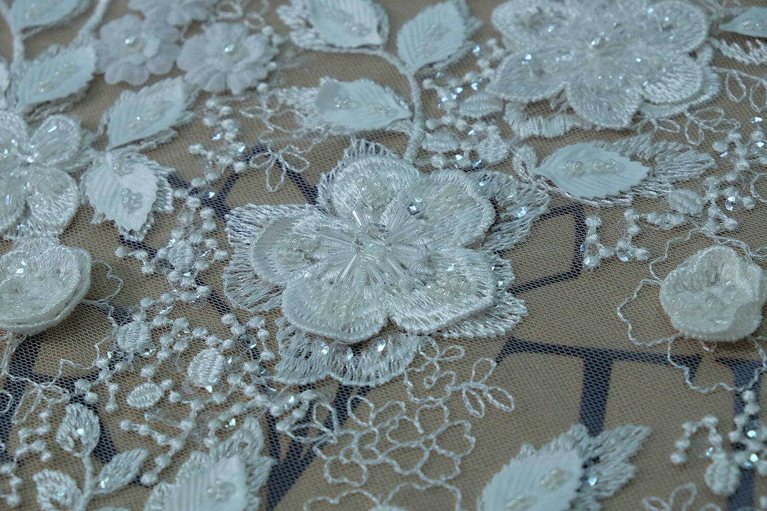 Incredibly exquisite lace fabric with 3D flowers, embroidered with various kinds of beads and sequins. The floral pattern adds volume and makes the fabric extremely attractive, while the milky color brings tenderness and elegance. The fabric is ideal for creating wedding dresses and festive outfits.