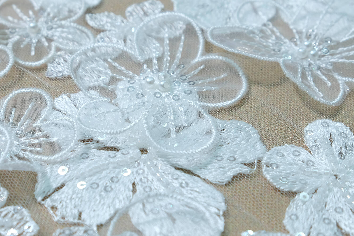 Lace fabric with 3D flowers impresses with its elegance and luxury. The pattern in the form of a scattering of flowers, transparent and milky, adds depth and charm to the fabric. The fabric is embroidered with beads and sequins that give it a shine and a unique shine. Ideal for creating wedding dresses, evening wear and exclusive designer products.