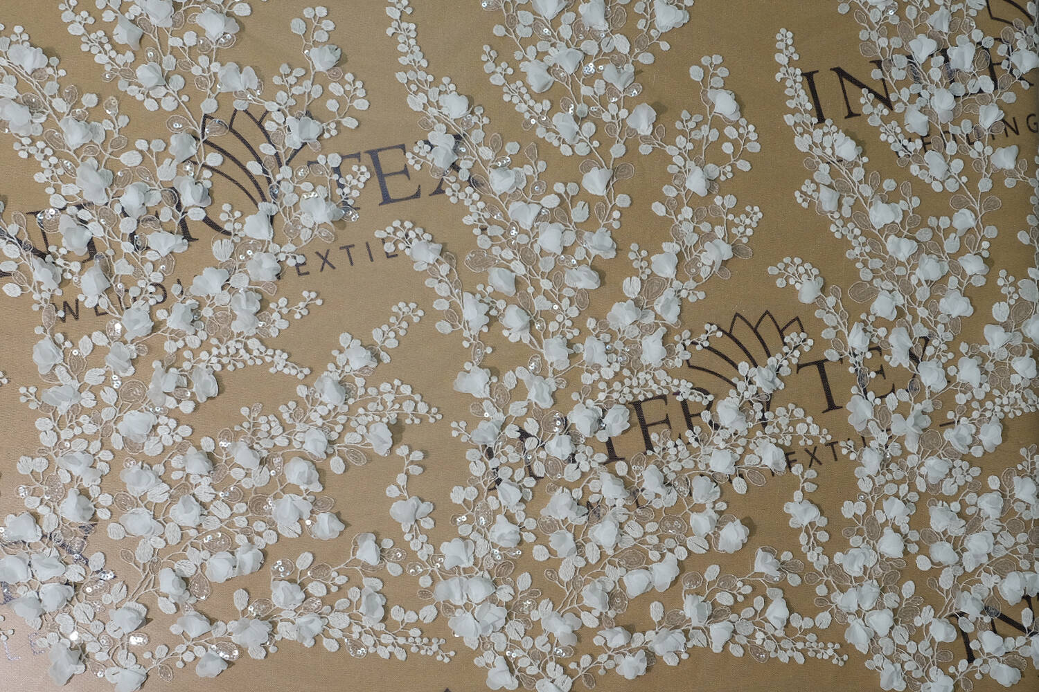 Milk-colored lace fabric with 3D flowers enchants with its elegance and sophistication. The floral pattern is complemented by sparkling sequins that add a luxurious look and depth to the fabric. It is an ideal choice for creating wedding dresses, evening wear and unique accessories.