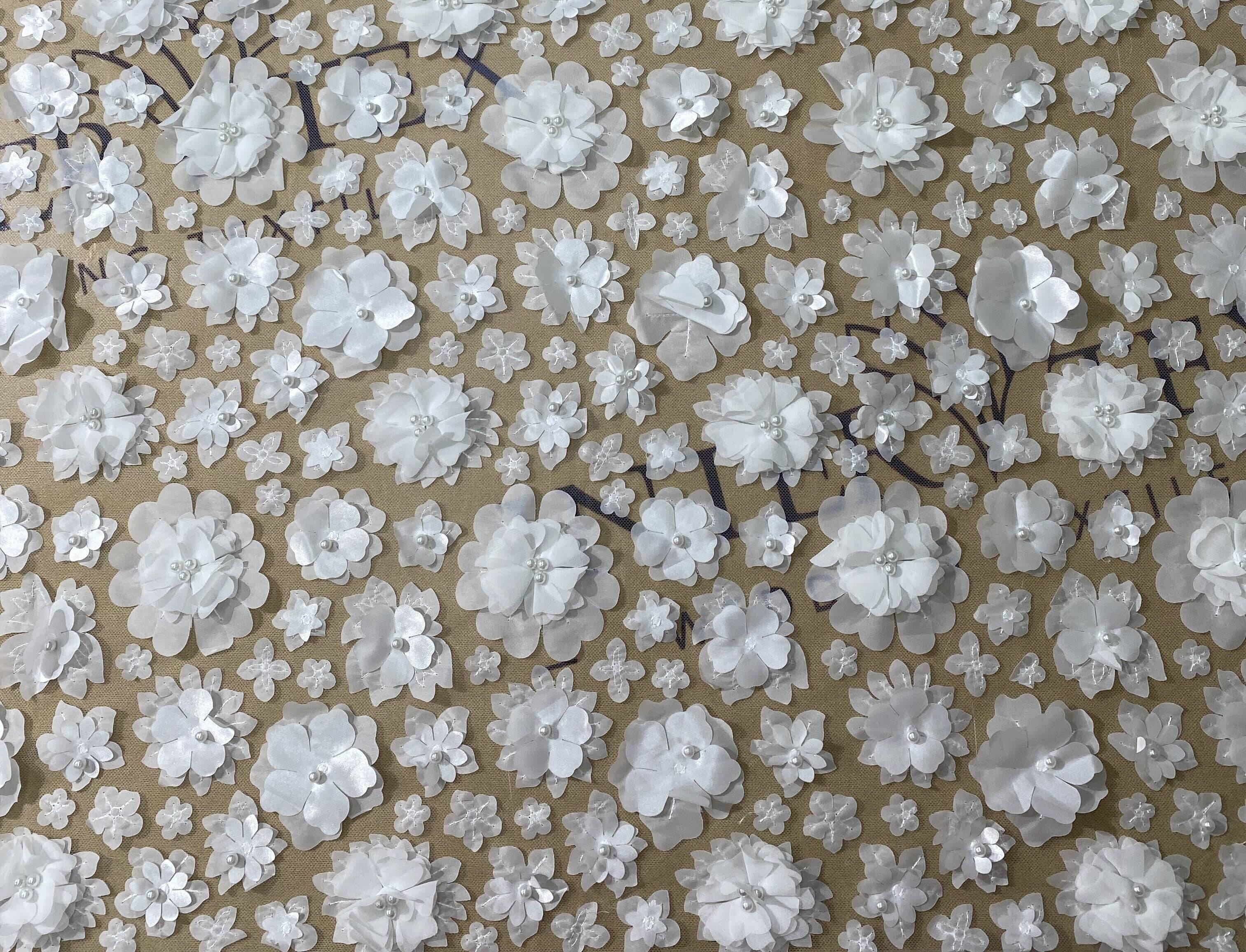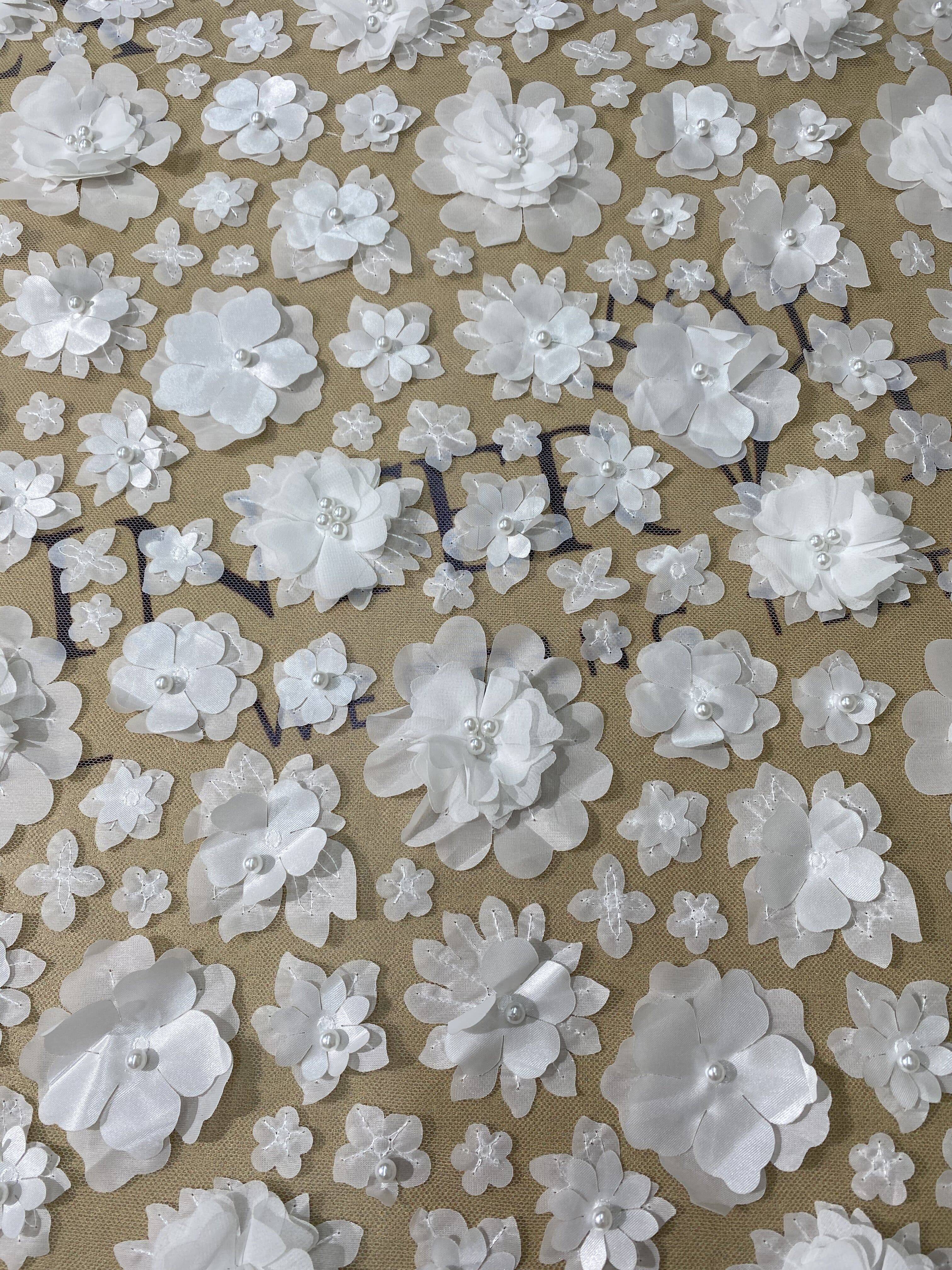 Lace fabric with 3D flowers fascinates with its luxurious design. The pattern consists of a scattering of flowers of different sizes on a mesh base. The milky color adds tenderness and elegance to the fabric, and the pearl embellishment adds extra charm and luxury to the product. This is an ideal canvas for wedding dresses or other festive outfits.