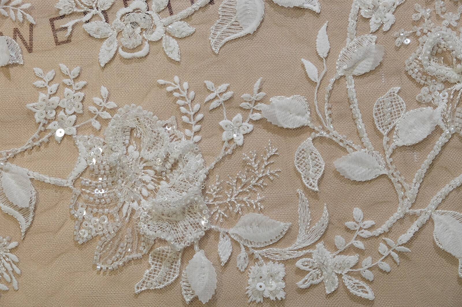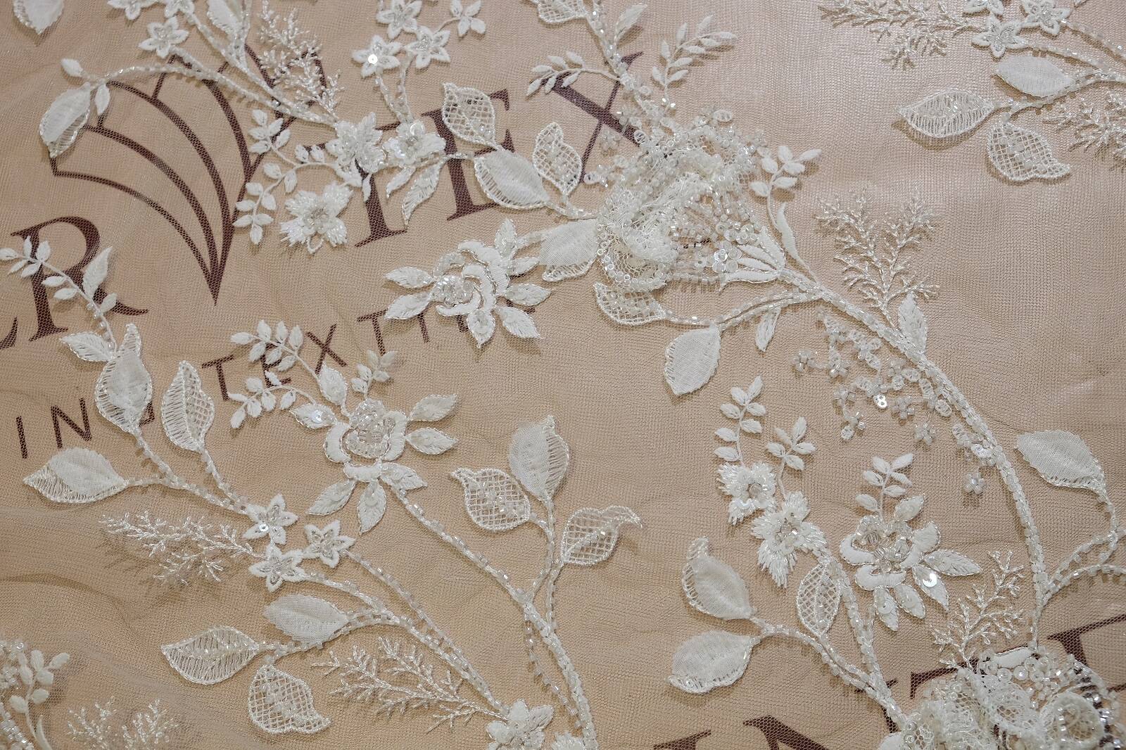 The 3D lace fabric has a delicate, airy base that gives it a light and weightless effect. The exquisite floral pattern intertwines smoothly, creating a harmonious ornament. Three-dimensional elements - embroidered flowers and leaves made from additional fabrics - add depth and layering. Beads, sequins and shimmering threads enhance its luxurious glow. This lace is ideal for creating wedding and evening gowns, especially for bodices, sleeves or decorative inserts. It can also be used to embellish accessories such as veils. Thanks to its transparent base, it pairs beautifully with other fabrics such as silk, tulle or satin.