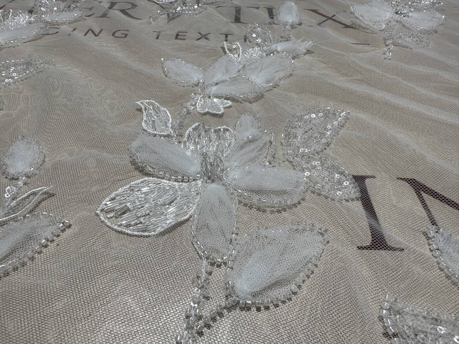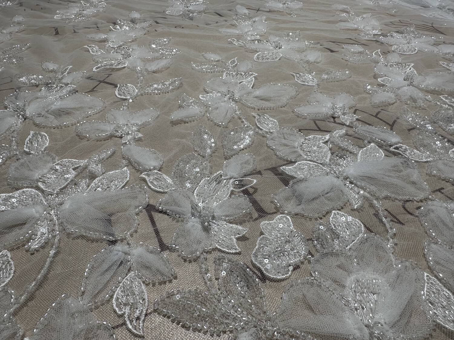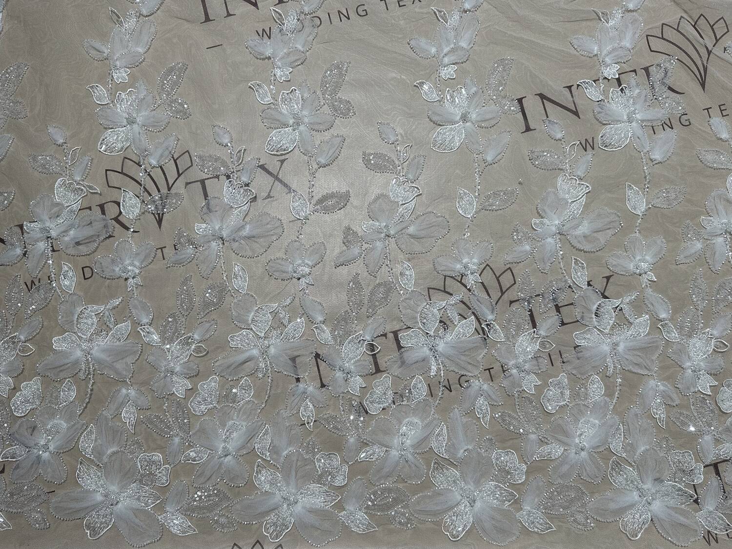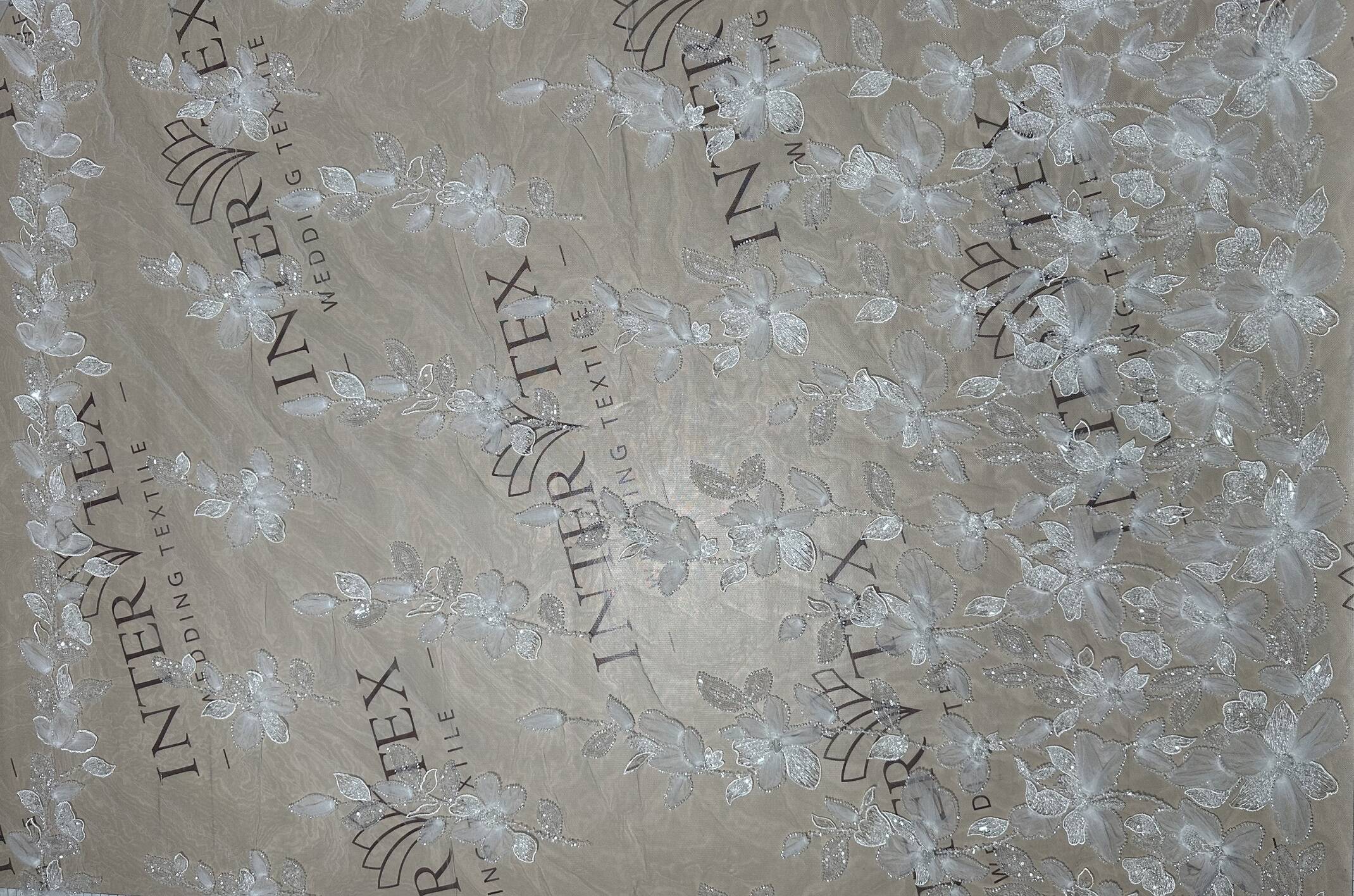3D lace fabric with floral motifs. The main material is transparent or tulle (mesh), and the patterns are made with white threads with a volume effect, which gives the flowers a special relief. The contours of flowers and leaves are emphasized by embroidery, with the addition of small beads or sequins that give a light shine. This lace fabric is used for wedding and cocktail dresses, for decorating veils or accessories, as well as for decorating sleeves.