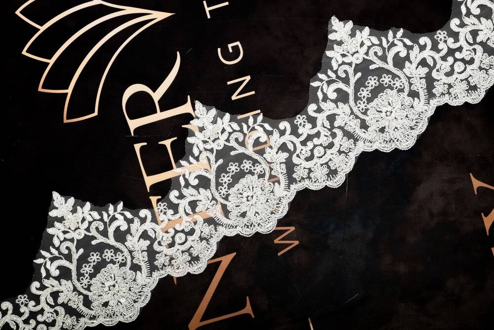 Beaded lace with cord is striking in its elegance. The pattern, consisting of flowers of different sizes with leaves and curls, creates a unique and sophisticated look. This lace is ideal for decorating wedding and evening dresses, adding a luxurious look to them. It can also be used to create stylish accessories and interior elements.