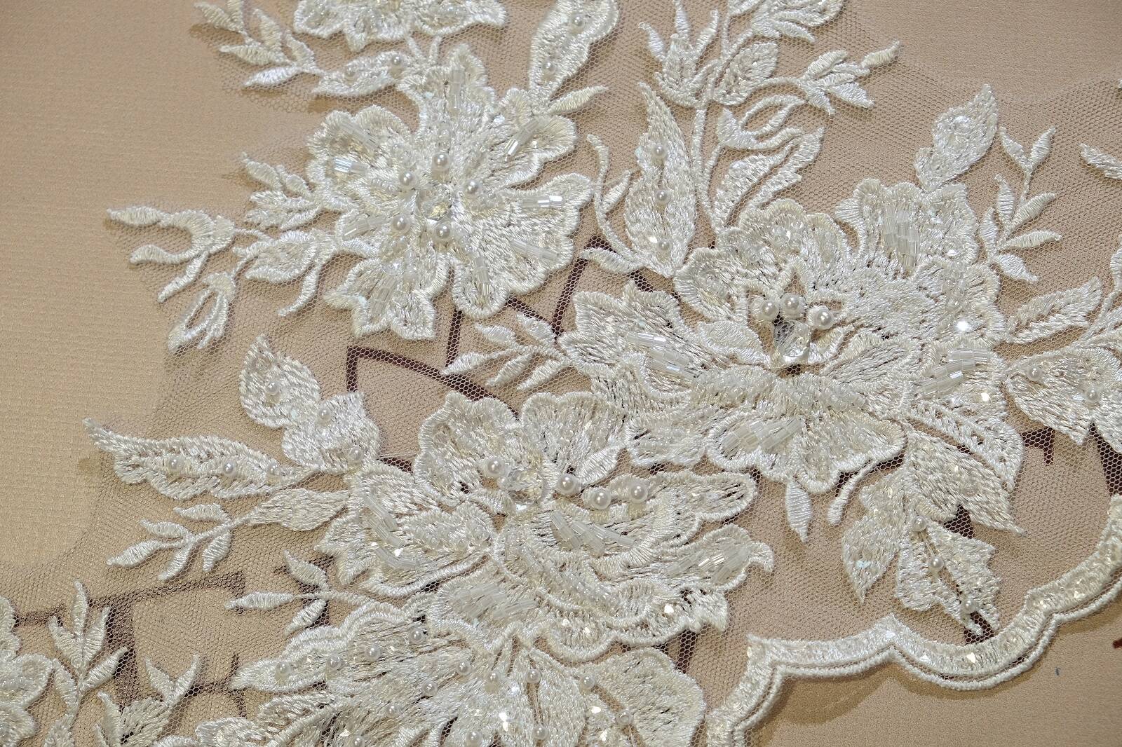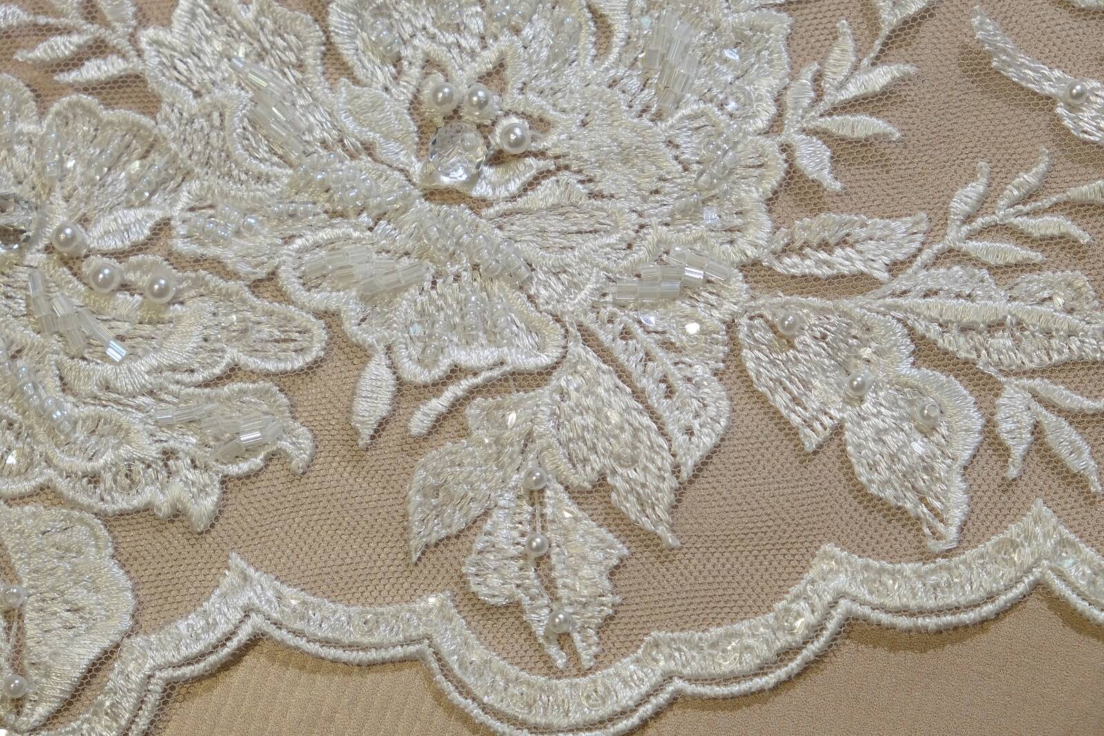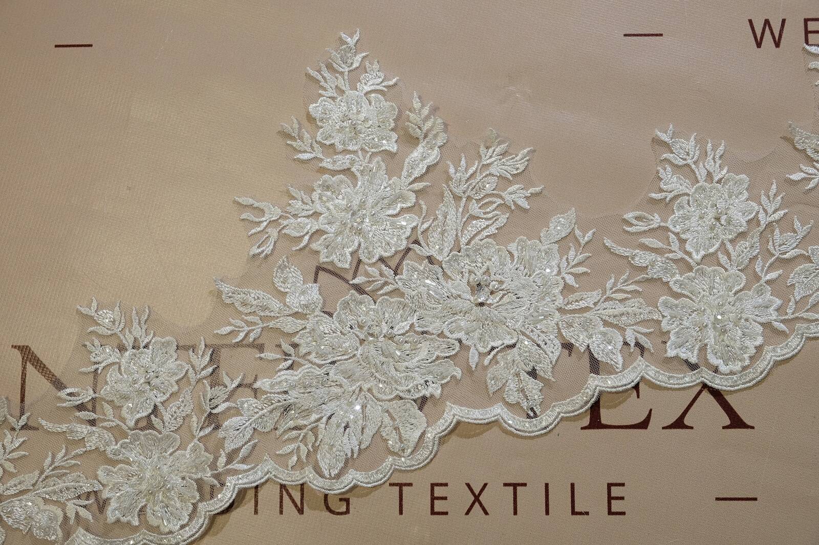An embroidered lace edge with a rich floral pattern. It is based on a thin transparent mesh, which adds lightness and allows it to be delicately combined with any fabric. The embroidery is made with shiny threads and is complemented by beads, sequins and pearls. The pattern consists of large and small flowers, thick leaves and curls arranged asymmetrically with a soft wavy edge. The lace is perfect for decorating wedding dresses, veils, evening or stage clothes, as well as accessories. It can be easily cut to a pattern and sewn on both by hand and by machine. It is the perfect choice for creating a luxurious look.