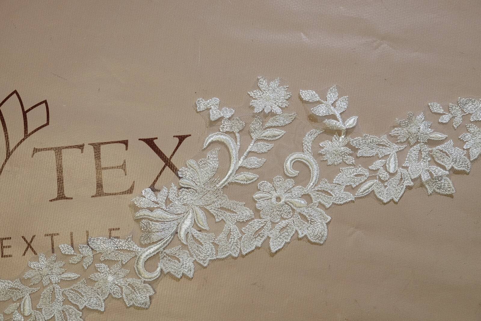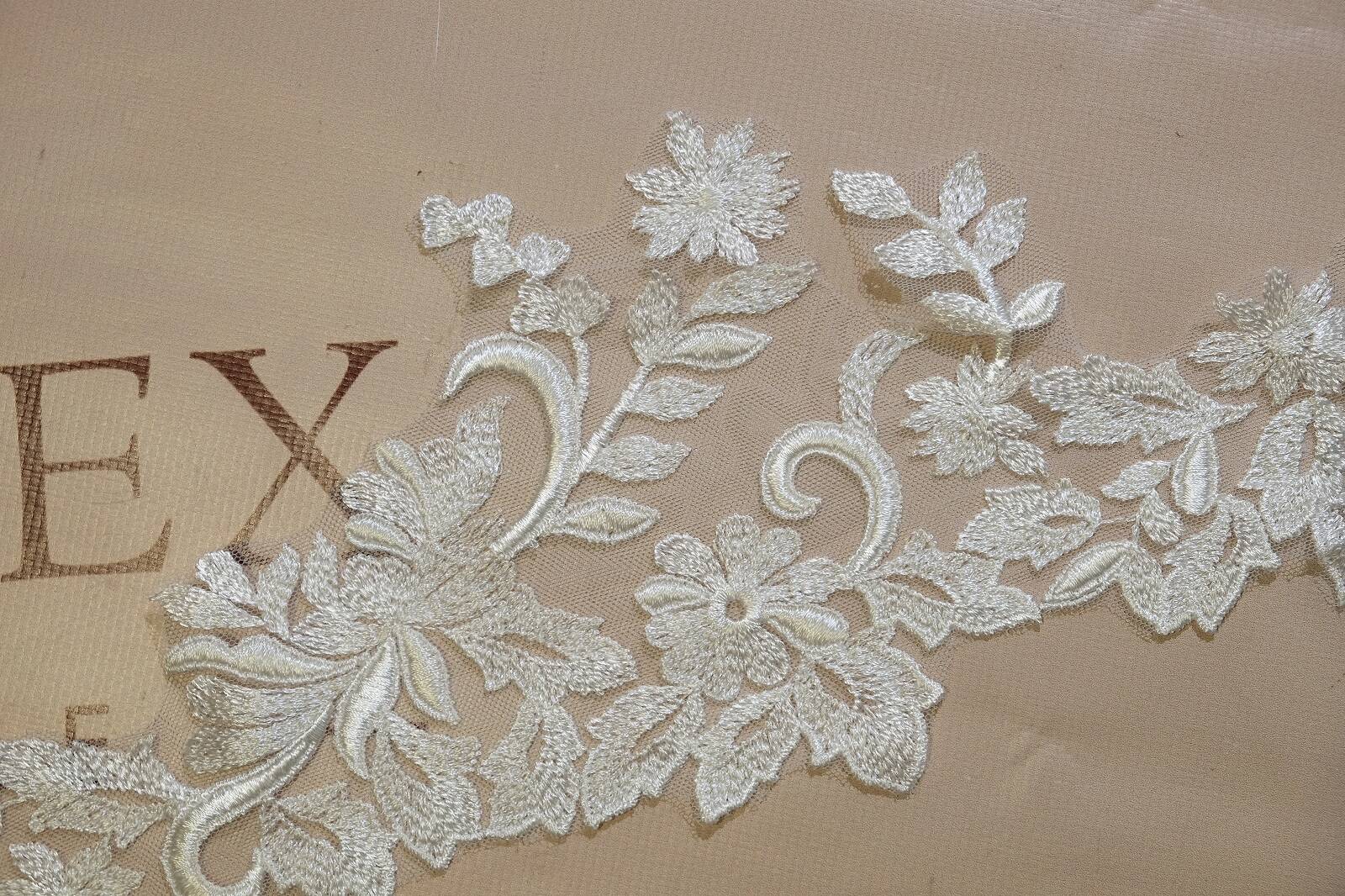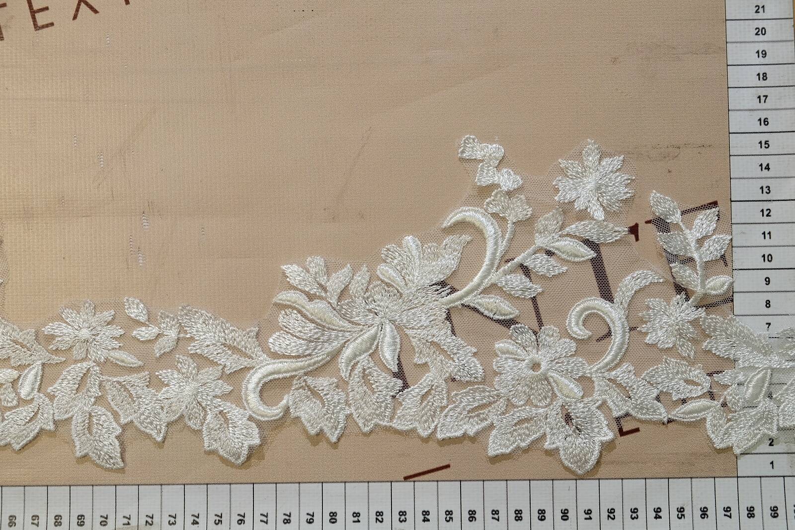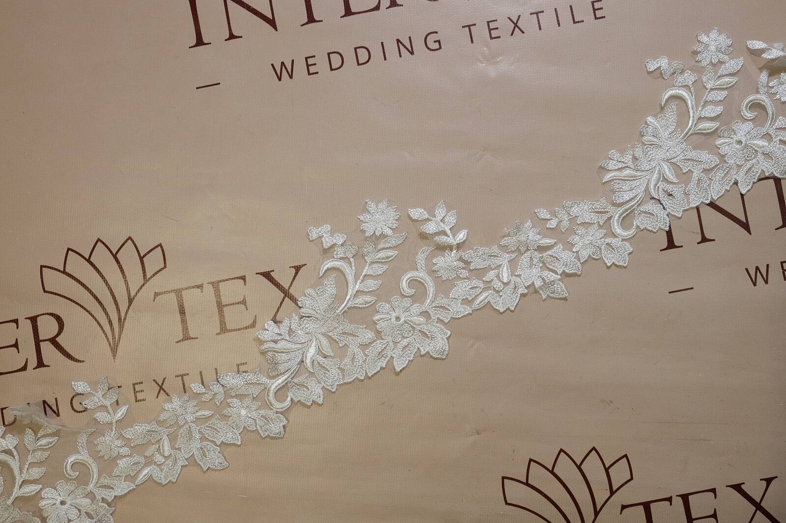 Не расшитый кружевной край с цветочным узором. Его основа - тонкая, прозрачная сетка, что обеспечивает легкость и элегантность изделия. Вышивка выполнена нитками с легким блеском. Рисунок состоит из цветов, листьев и завитков, расположенных асимметрично, с выразительным направлением. Такое кружево часто используют для отделки свадебных платьев, вечерней одежды, фаты, белья и тому подобное. Его преимущества - легкость, декоративность, возможность точного кроя по узору. Кайма легко пришивается вручную или машинкой. Благодаря прозрачной основе хорошо комбинируется с различными тканями.