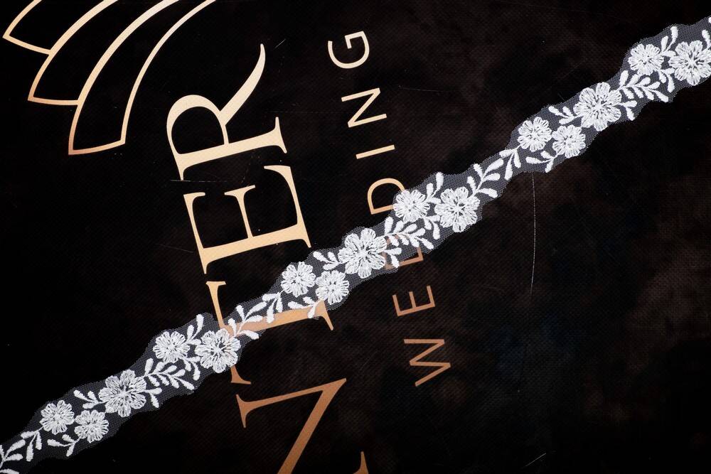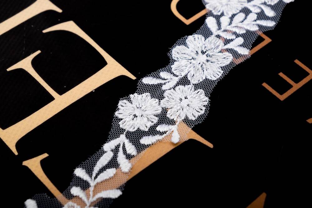 Кружево в белом цвете создано для добавления утонченности вашим изделиям. На прозрачной сетке расположены нежные цветы, украшенные блестящими пайетками, что придает кружеву элегантный вид. Этот узкий кружевной край идеально подходит для отделки свадебных платьев, аксессуаров, декоративных элементов интерьера.