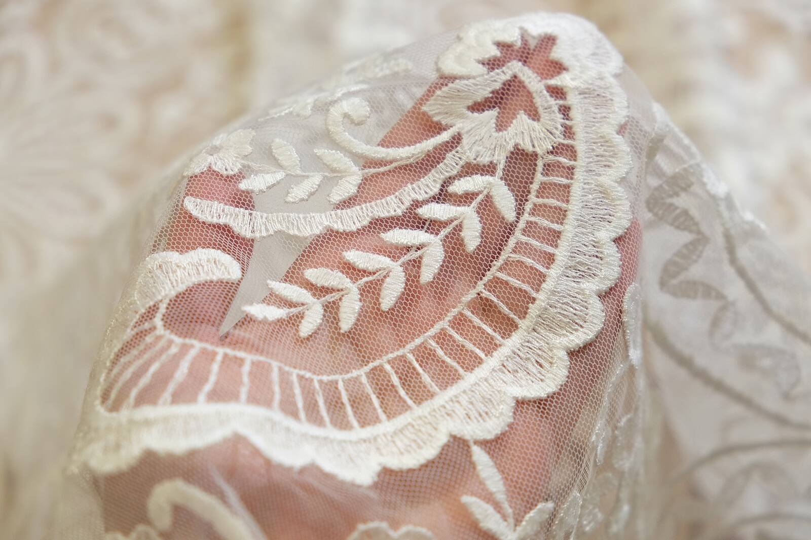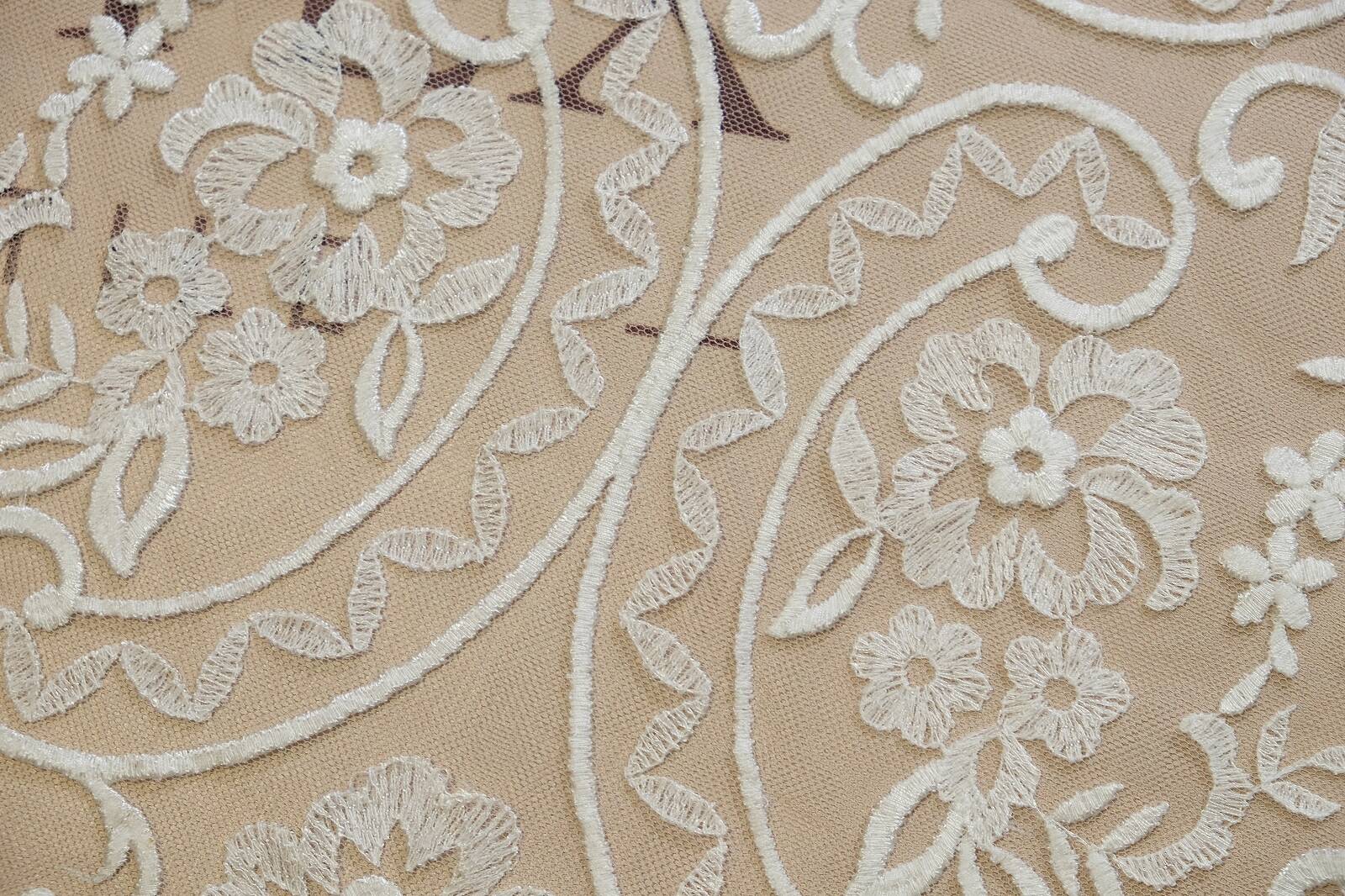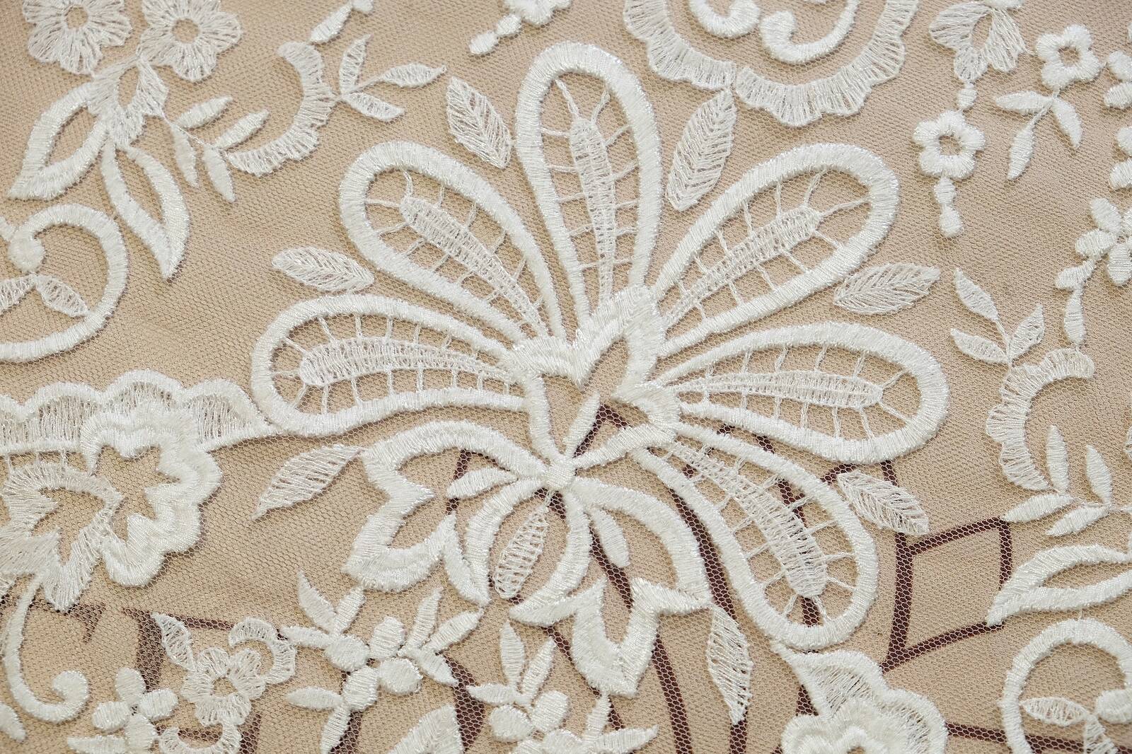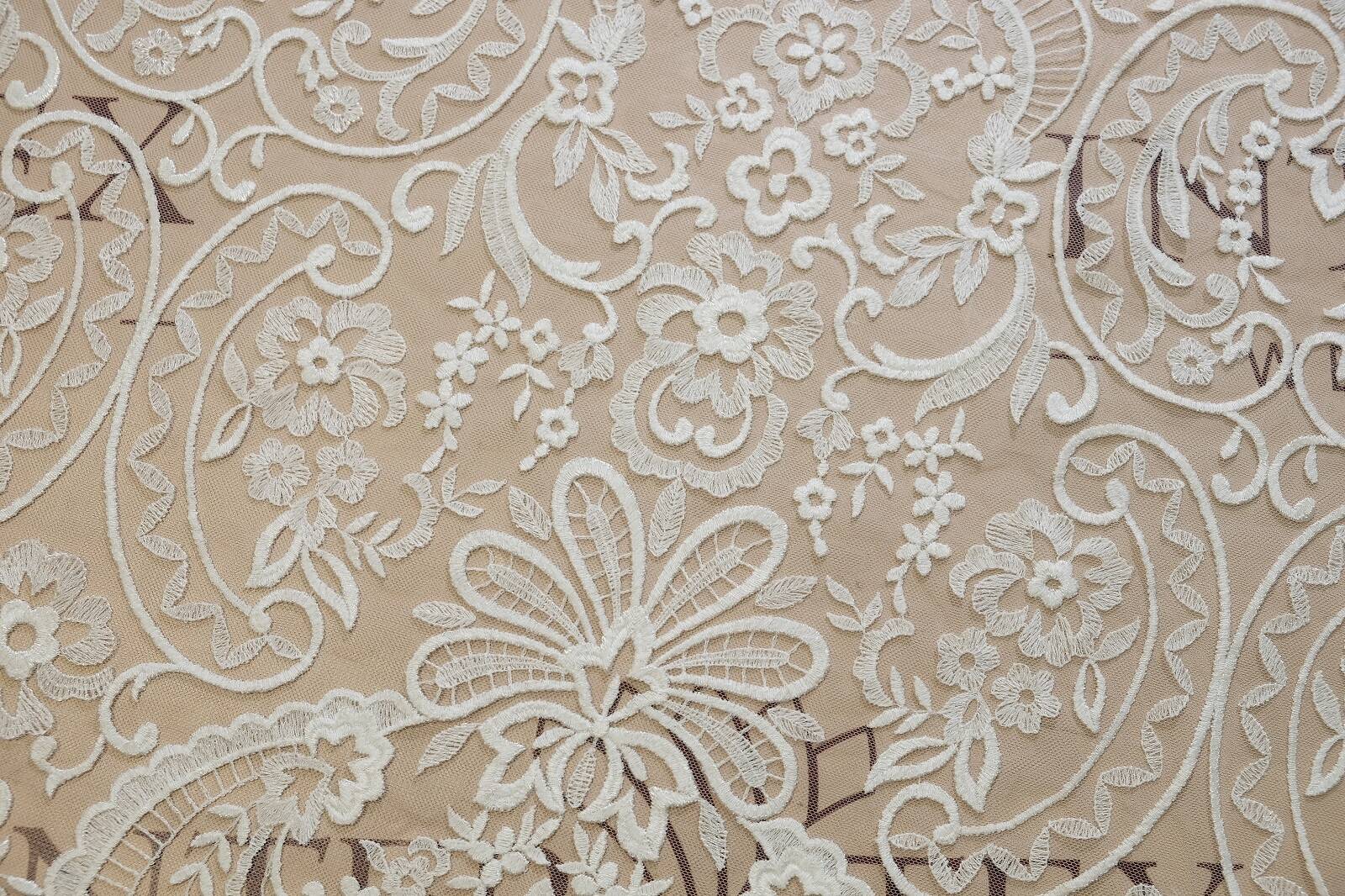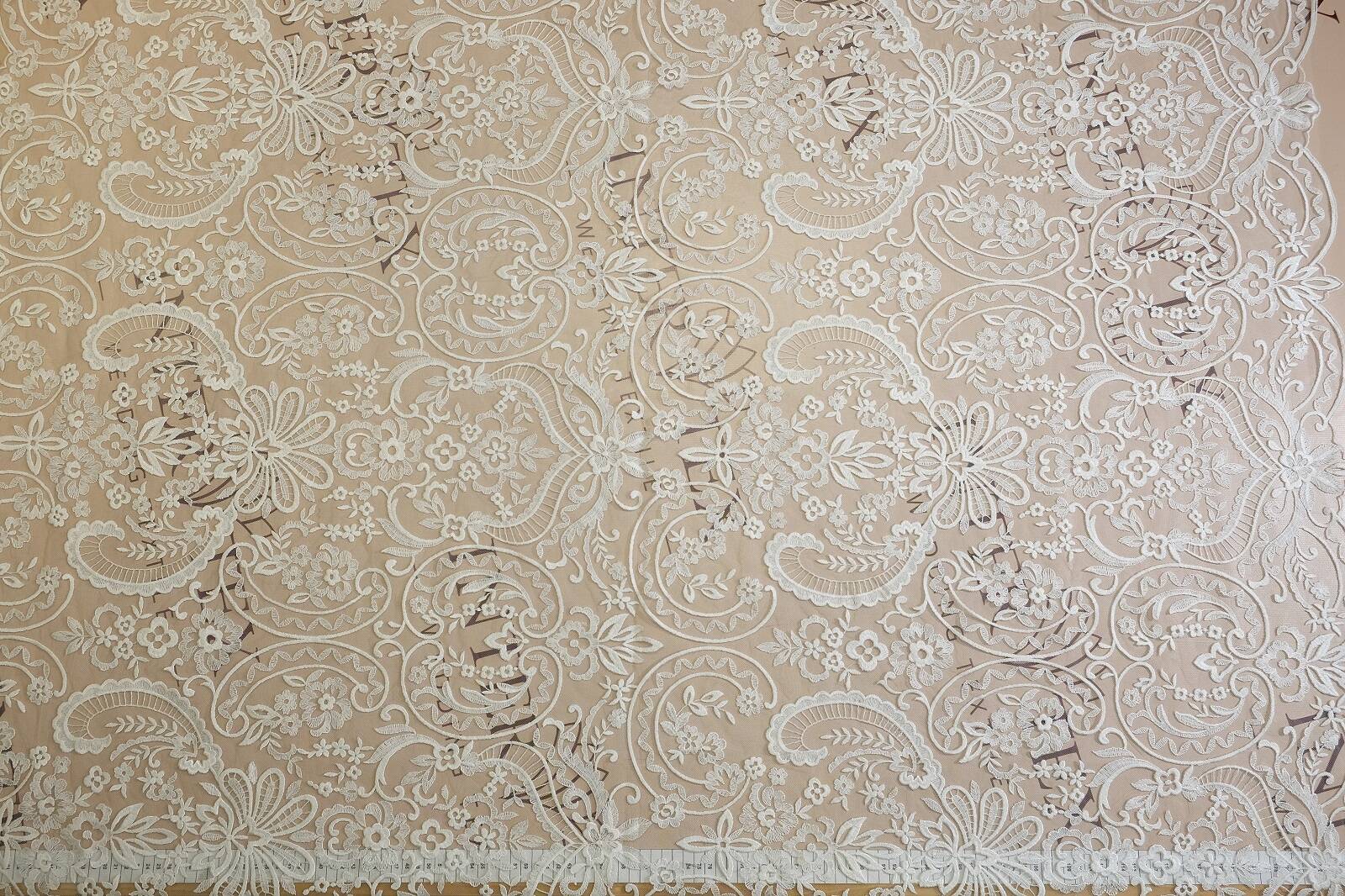 Нерасшитое кружевное полотно - изысканная ткань, сочетающая классический стиль и утонченную элегантность. Рисунок состоит из богатых цветочных орнаментов, лиственных узоров и завитков в стиле «пейсли». Основа изготовлена из легкой сетки, которая создает эффект воздушности. Полотно выглядит сдержанно и благородно, что делает его универсальным в использовании. Такой материал идеально подходит для пошива свадебных и вечерних платьев, в частности для создания рукавов, корсетных вставок, накидок. Его можно применять в дизайне блуз, юбок, для отделки текстильного декора. Это идеальный выбор для тех, кто ценит классику, эстетику и нежность в тканях.
