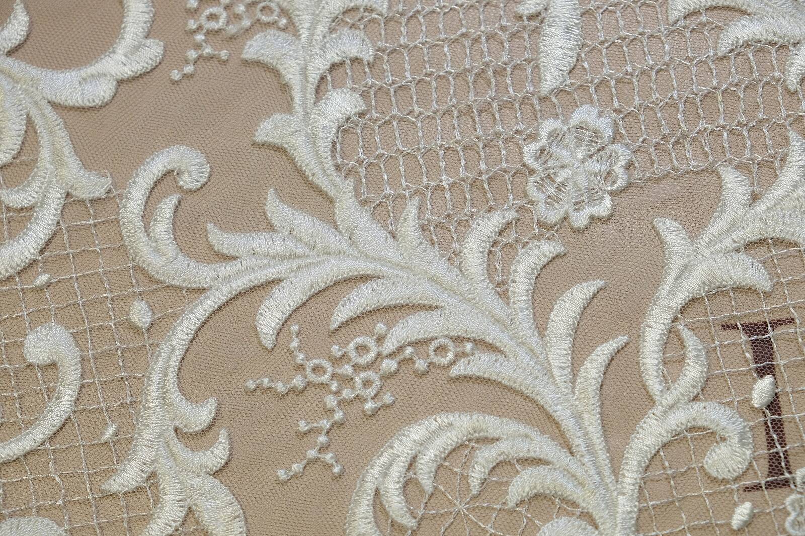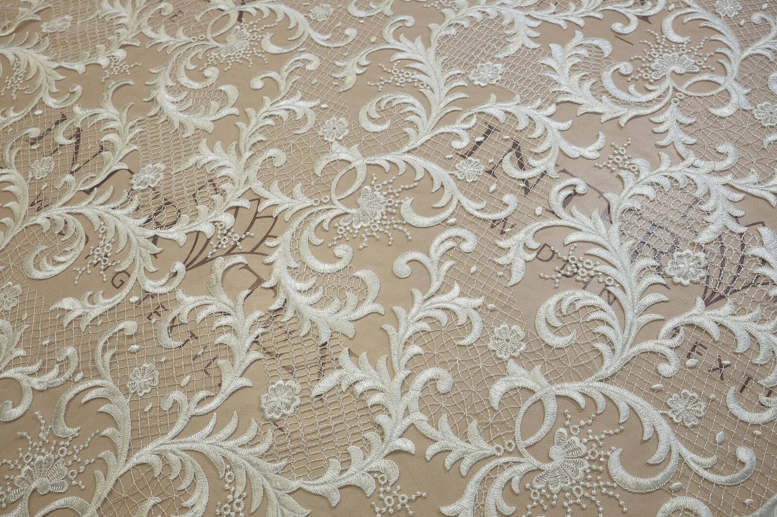 Нерасшитое кружево на тонкой прозрачной основе украшено изящным узором в виде плавных завитков и нежных цветочных мотивов. Основной рисунок состоит из крупных волнистых элементов, напоминающих растительные орнаменты, гармонично сочетающиеся с мелкими сетчатыми вставками. Цветочные детали расположены равномерно, создавая эффект легкости и воздушности. Благодаря своей элегантности и нежности, это кружевное полотно идеально подходит для создания свадебных платьев, романтических вечерних образов, корсетов. Также его можно использовать для декоративной отделки текстильных изделий и создания изящных аксессуаров.