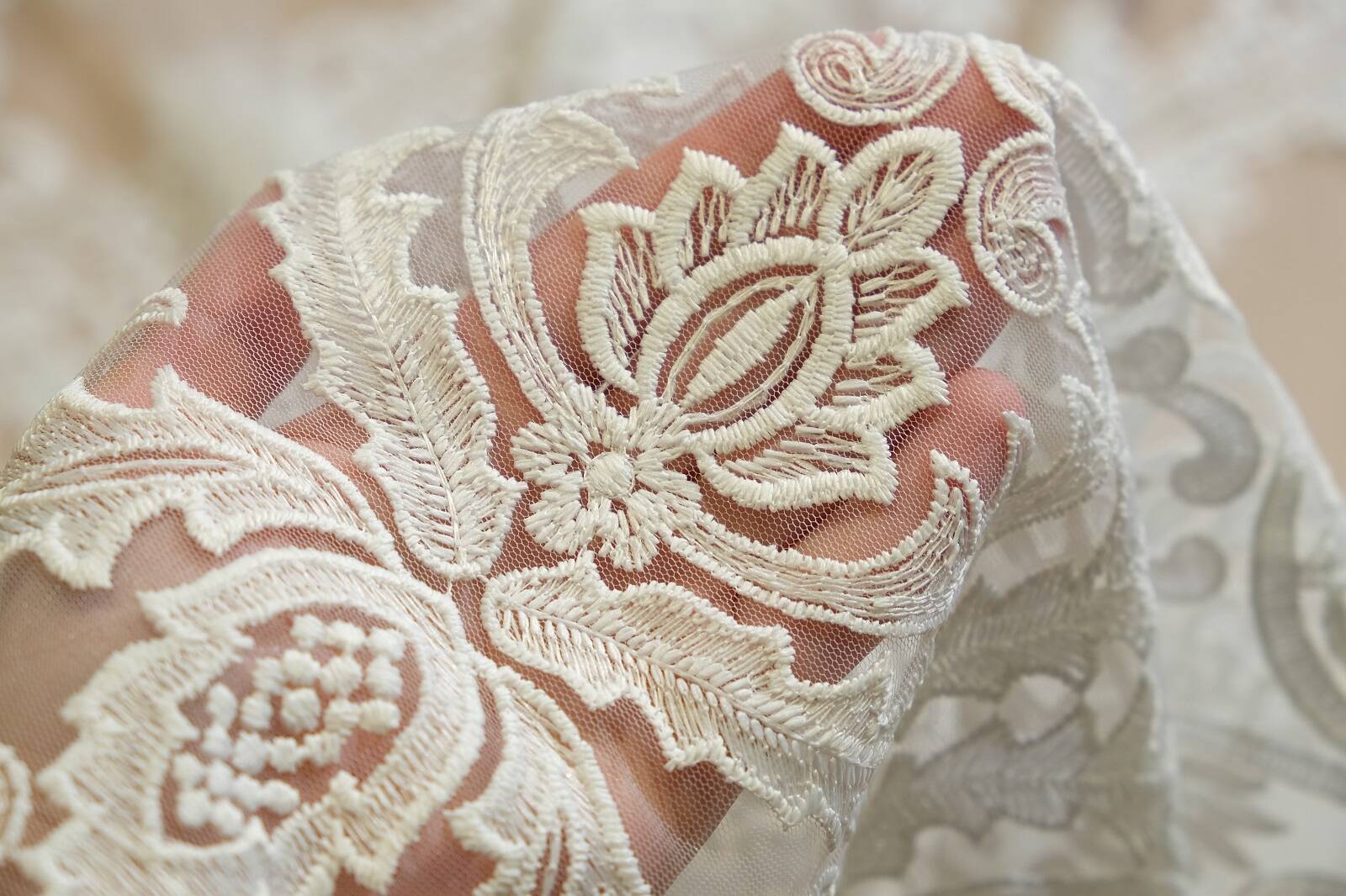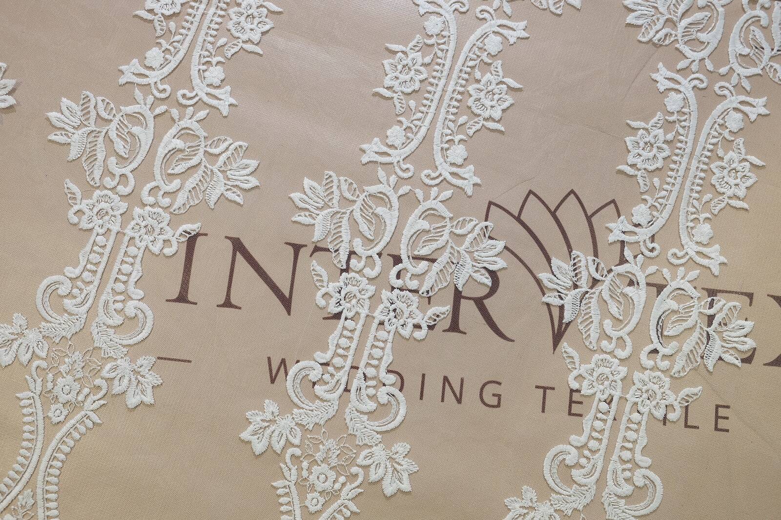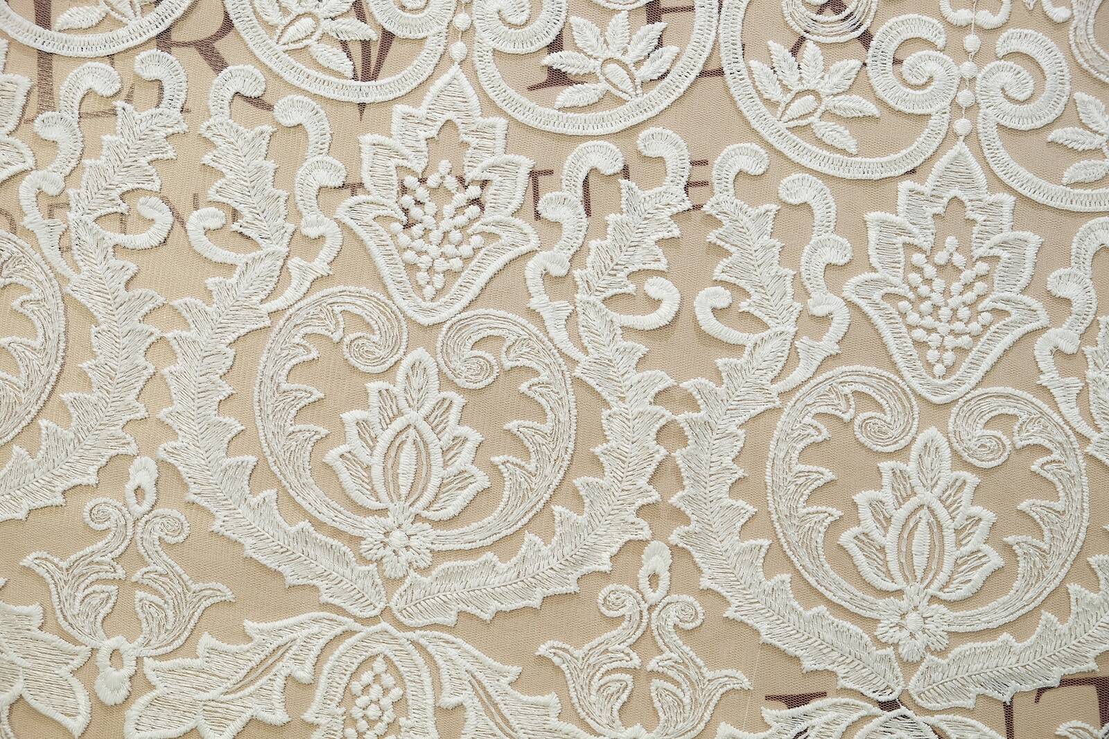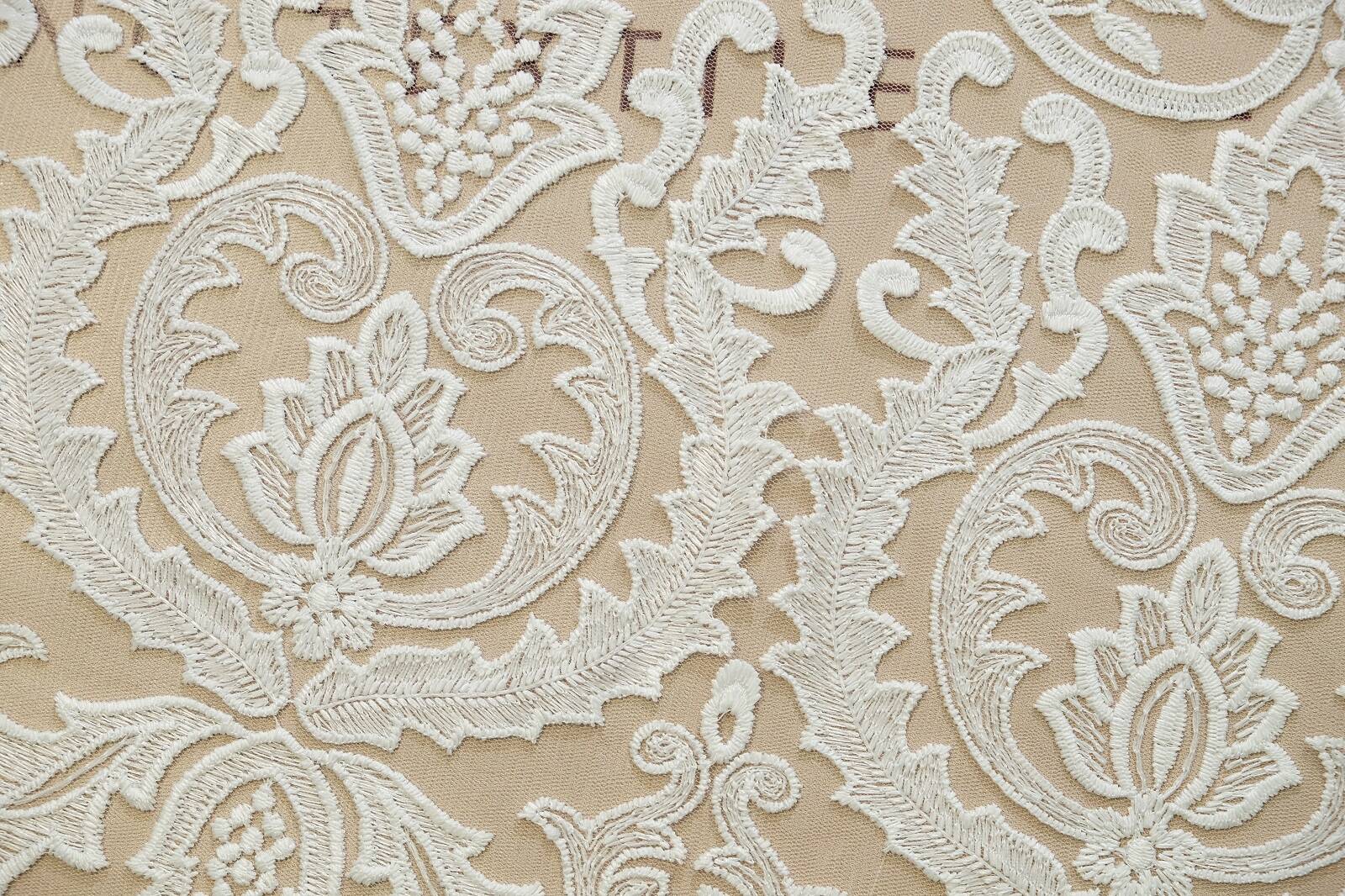 Нерасшитое кружевное полотно восхищает легкостью и нежностью. Основа выполнена из тонкой сетки, а узор сочетает цветочные мотивы, завитки и геометрические элементы. Благодаря симметричному построению орнамента ткань универсальна в использовании. Полотно подходит для пошива платьев, накидок, декоративных элементов нарядов, а также для отделки интерьеров. Кружево легко сочетается с другими материалами, например атласом или органзой, добавляя изделиям изысканности без перегрузки образа.
