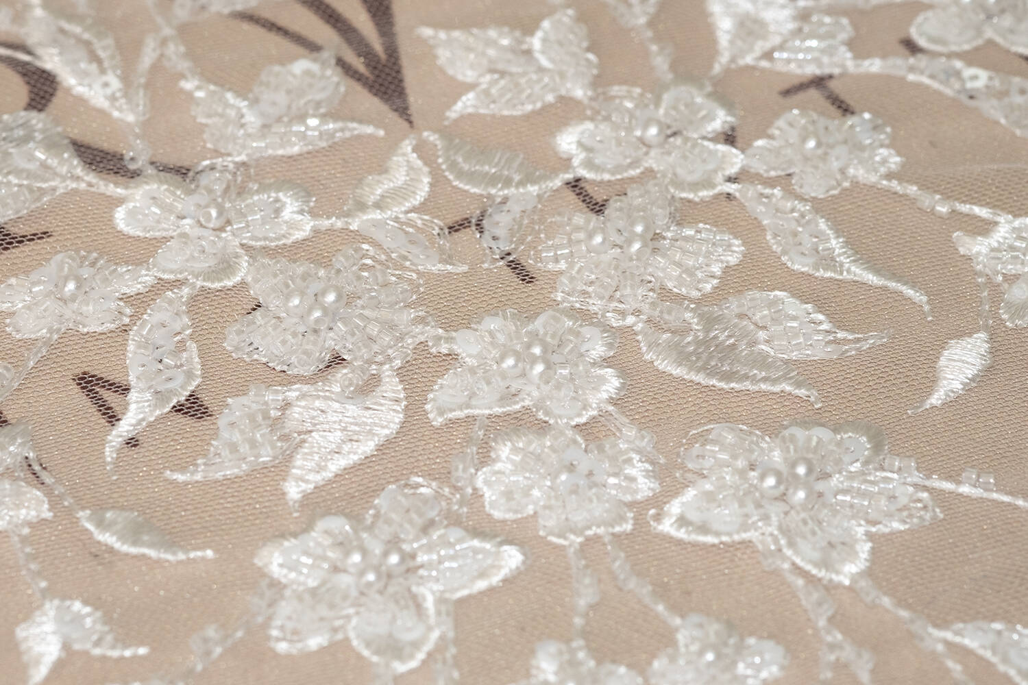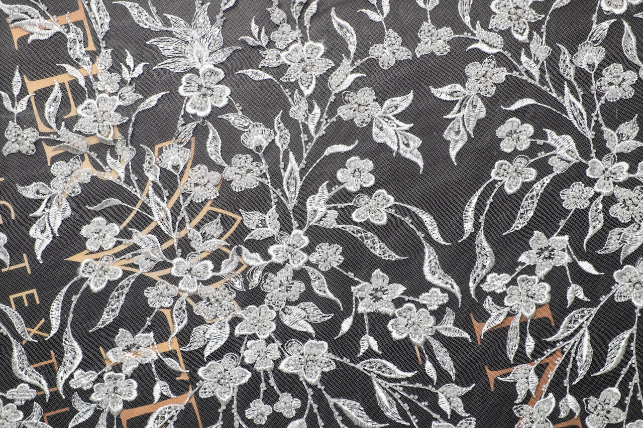 Расшитое кружевное полотно - это изысканная ткань, на которой узор изготовлен с помощью вшитых или прикрепленных декоративных элементов, таких как бисер, пайетки, жемчужины и тому подобное. Они добавляют полотну текстурной глубины и создают эффектные детали, делая кружево особенно изысканным и богатым. Расшитое кружево часто используется для изготовления свадебных платьев, вечерних нарядов, а также для декорирования аксессуаров.