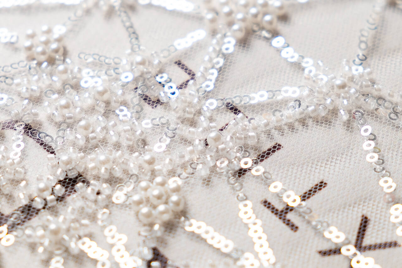Это нежное кружевное полотно идеально подходит для создания свадебных платьев. Материал придает образу невесты легкости и торжественности. Оригинальный узор, жемчужинки, пайетки и ручная вышивка придадут очарования свадебному платью и помогут завершить свадебный образ.