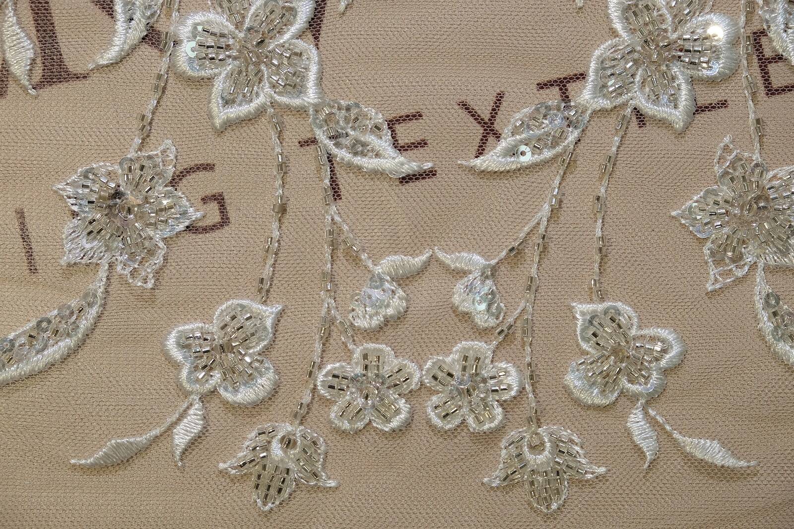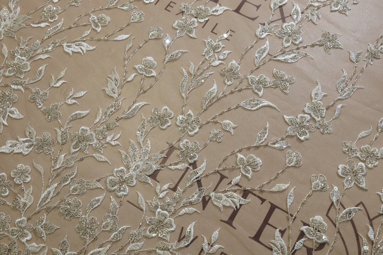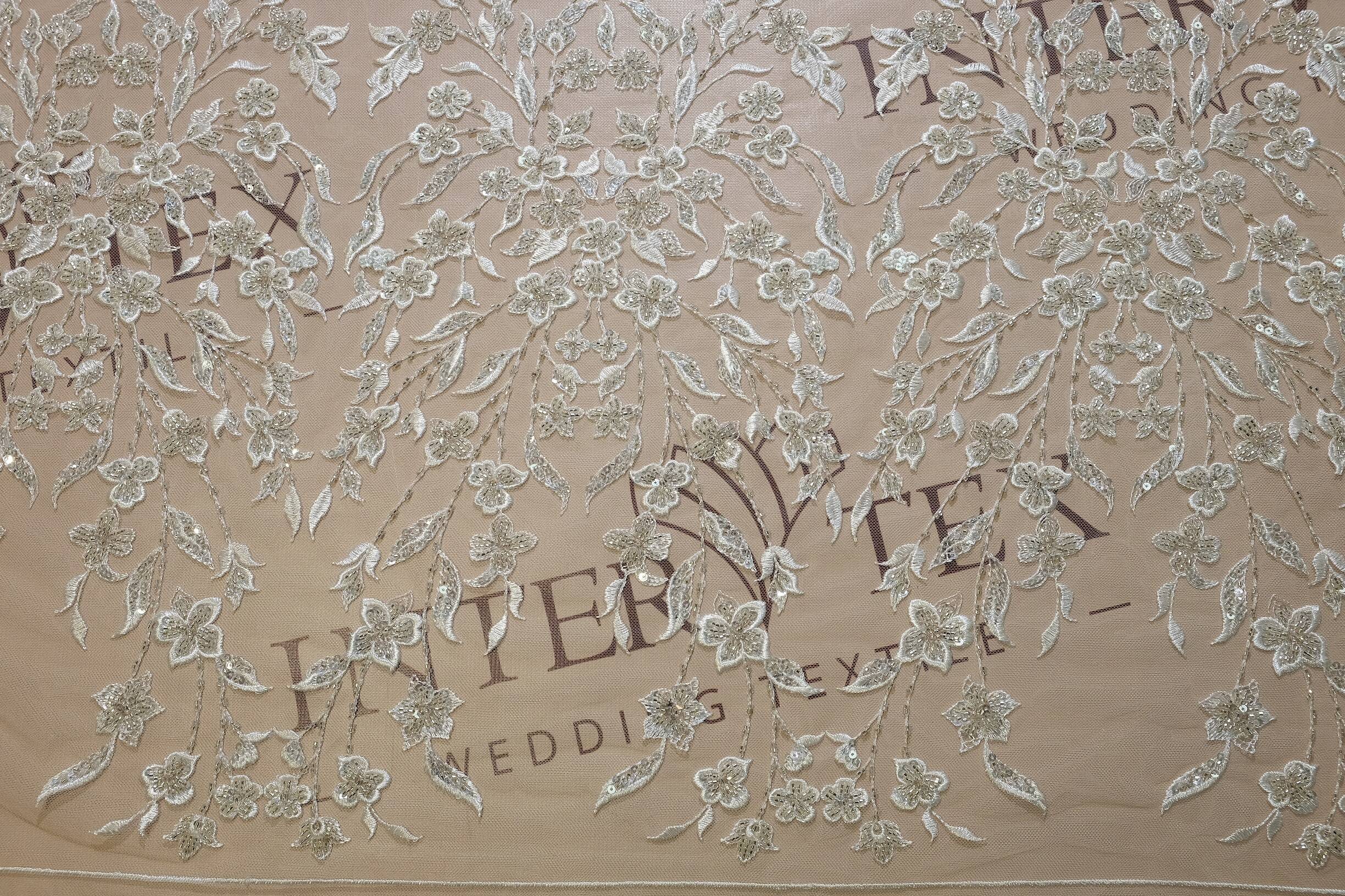 Расшитое кружевное полотно - это изысканная ткань, на которой узор изготовлен с помощью вшитых или прикрепленных декоративных элементов, таких как бисер, пайетки, жемчужины и тому подобное. Они добавляют полотну текстурной глубины и создают эффектные детали, делая кружево особенно изысканным и богатым. Расшитое кружево часто используется для изготовления свадебных платьев, вечерних нарядов, а также для декорирования аксессуаров.