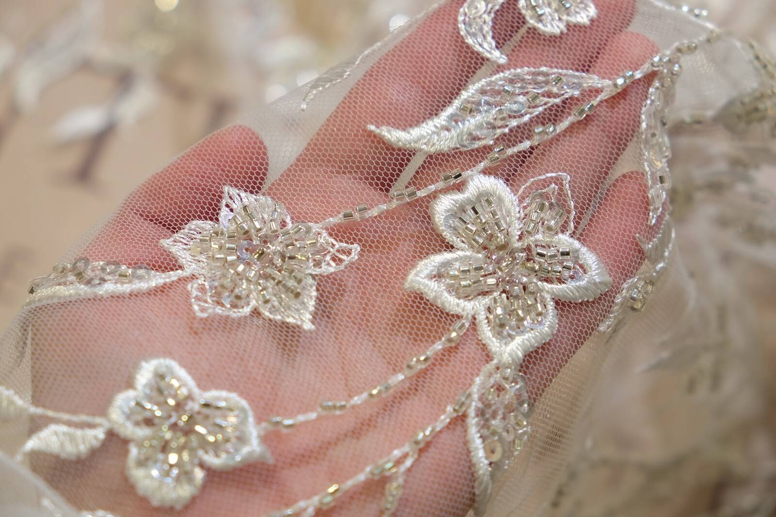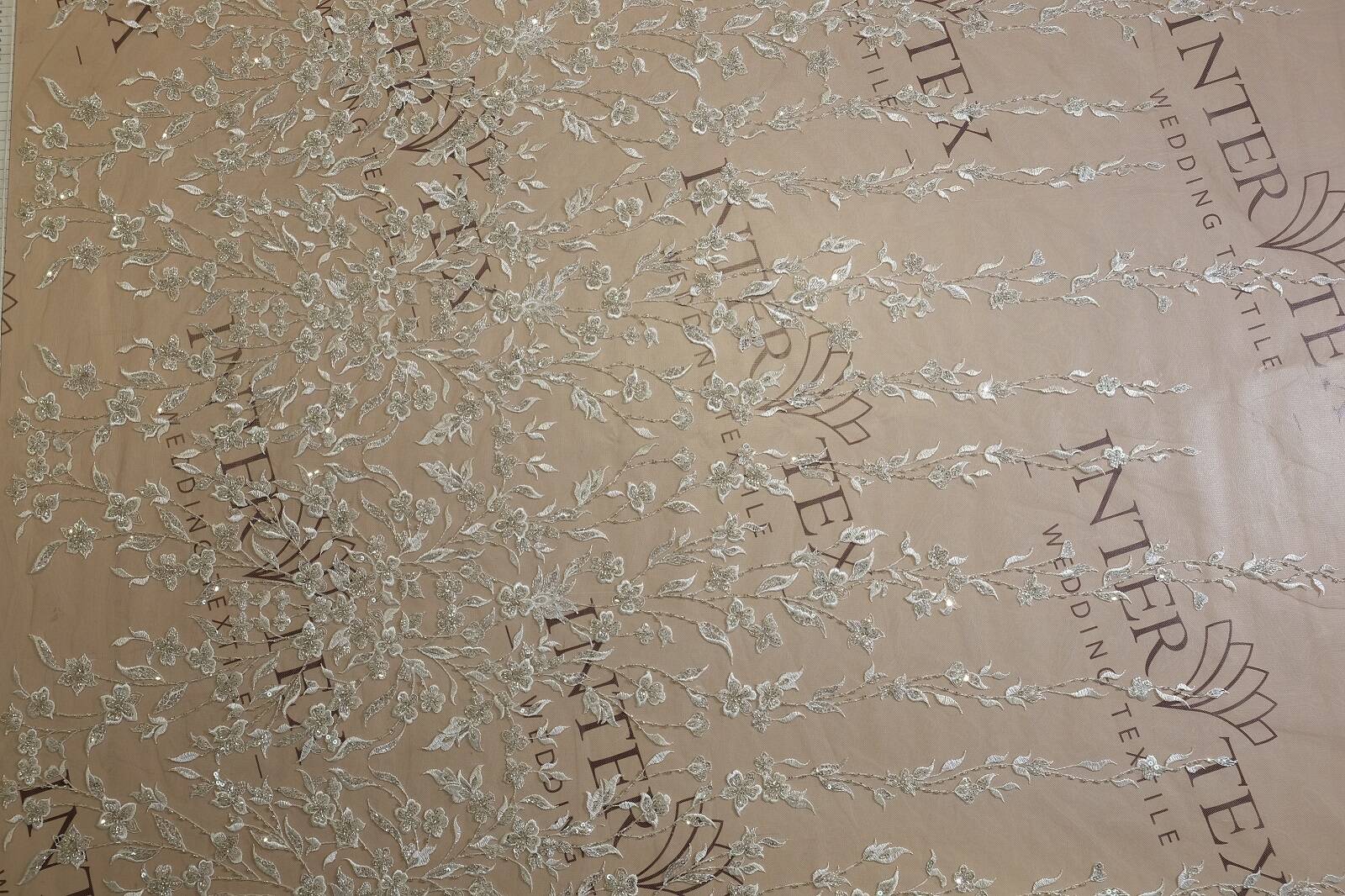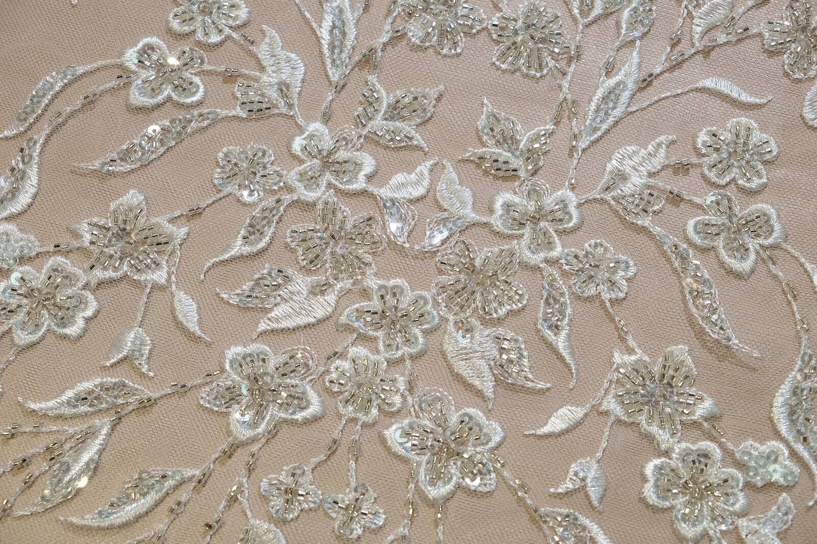 Расшитое кружевное полотно - это изысканная ткань, на которой узор изготовлен с помощью вшитых или прикрепленных декоративных элементов, таких как бисер, пайетки, жемчужины и тому подобное. Они добавляют полотну текстурной глубины и создают эффектные детали, делая кружево особенно изысканным и богатым. Расшитое кружево часто используется для изготовления свадебных платьев, вечерних нарядов, а также для декорирования аксессуаров.
